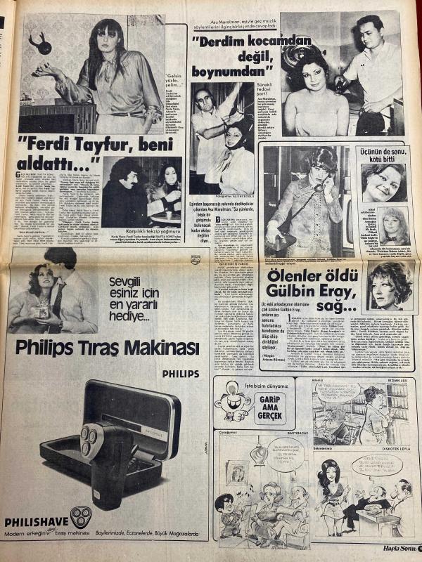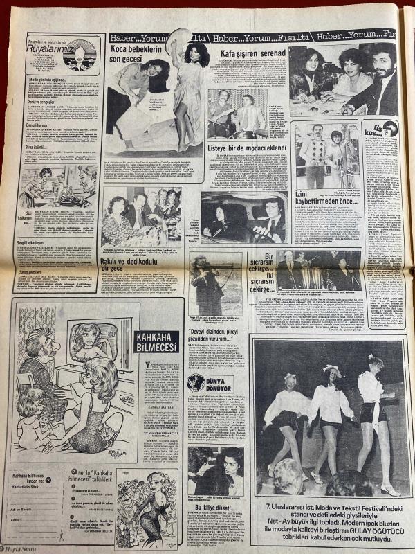 HAFTA SONU GAZETESİ DOĞUM GÜNÜ HEDİYESİ - 23 ŞUBAT 1979 - TAM TAKIM 12 SAYFADIR -Türkan Şoray-Hülya Koçyiğit-Filiz Akın-Bülent Ersoy-Bahar Erdeniz-Engin Verel-Erol Büyükburç-Emel Sayın-Ferdi Tayfur-Asu Maralman-Gülbin Eray-Mediha Şen-Ümit Çelmen-Müjdat Gezen-Cüneyt Arkın-Zeki Müren-Ahmet Özhan-Talat Yörük-Kenan Pars-Meral Konrat-Nurhan Yılmaz-Muharrem Gürses-Mine Mutlu-Muazzez Arçay-Ayşe Uğurlu-Yılmaz Güney-Selahattin İçli-Süleyman Demirel-Fahrettin Aslan-Nesrin Sipahi-Sadiye Ayhan-Güngör Başar-Mine Çayırlı-Nihal Atsız-Cüneyt Türel-Muzaffer Aslan Olmaz böyle şey-Marifetli Rus bebeği-Bu düpedüz çılgınlıktır-Bahar Erdeniz evleniyor-Başa dert olan şapkalar-Zayıflamaya bugünden başlayın-Apandisit sancısını gaz sancısından ayırmak-Bütün dertlerin yolu mideden geçer-Akıl almaz bir sahtekârlık-Emel Sayın’a yardım yağıyor-Yalanın bedeli-Ferdi Tayfur beni aldattı-Derdim kocamdan değil boynumdan-Ölenler öldü Gülbin Eray sağ-Buna parasıyla rezil olmak denir-Benim iki pırlantam var-, ORHAN OLCAY tarafından kaleme alınmıştır. Eser AHMET ERÇALIK editörlüğünde hazırlanmıştır. Kitap HÜNGÜN GAZETECİLİK VE MATBAACILIK A.Ş. tarafından yayınlanmıştır. 12 sayfadır. HAFTA SONU GAZETESİ DOĞUM GÜNÜ HEDİYESİ - 23 ŞUBAT 1979 - TAM TAKIM 12 SAYFADIR -Türkan Şoray-Hülya Koçyiğit-Filiz Akın-Bülent Ersoy-Bahar Erdeniz-Engin Verel-Erol Büyükburç-Emel Sayın-Ferdi Tayfur-Asu Maralman-Gülbin Eray-Mediha Şen-Ümit Çelmen-Müjdat Gezen-Cüneyt Arkın-Zeki Müren-Ahmet Özhan-Talat Yörük-Kenan Pars-Meral Konrat-Nurhan Yılmaz-Muharrem Gürses-Mine Mutlu-Muazzez Arçay-Ayşe Uğurlu-Yılmaz Güney-Selahattin İçli-Süleyman Demirel-Fahrettin Aslan-Nesrin Sipahi-Sadiye Ayhan-Güngör Başar-Mine Çayırlı-Nihal Atsız-Cüneyt Türel-Muzaffer Aslan Olmaz böyle şey-Marifetli Rus bebeği-Bu düpedüz çılgınlıktır-Bahar Erdeniz evleniyor-Başa dert olan şapkalar-Zayıflamaya bugünden başlayın-Apandisit sancısını gaz sancısından ayırmak-Bütün dertlerin yolu mideden geçer-Akıl almaz bir sahtekârlık-Emel Sayın’a yardım yağıyor-Yalanın bedeli-Ferdi Tayfur beni aldattı-Derdim kocamdan değil boynumdan-Ölenler öldü Gülbin Eray sağ-Buna parasıyla rezil olmak denir-Benim iki pırlantam var- adlı eser Türkçe dilindedir.