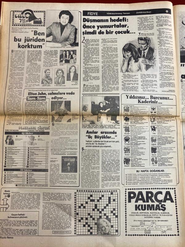 HAFTA SONU GAZETESİ DOĞUM GÜNÜ HEDİYESİ - 23 ŞUBAT 1979 - TAM TAKIM 12 SAYFADIR -Türkan Şoray-Hülya Koçyiğit-Filiz Akın-Bülent Ersoy-Bahar Erdeniz-Engin Verel-Erol Büyükburç-Emel Sayın-Ferdi Tayfur-Asu Maralman-Gülbin Eray-Mediha Şen-Ümit Çelmen-Müjdat Gezen-Cüneyt Arkın-Zeki Müren-Ahmet Özhan-Talat Yörük-Kenan Pars-Meral Konrat-Nurhan Yılmaz-Muharrem Gürses-Mine Mutlu-Muazzez Arçay-Ayşe Uğurlu-Yılmaz Güney-Selahattin İçli-Süleyman Demirel-Fahrettin Aslan-Nesrin Sipahi-Sadiye Ayhan-Güngör Başar-Mine Çayırlı-Nihal Atsız-Cüneyt Türel-Muzaffer Aslan Olmaz böyle şey-Marifetli Rus bebeği-Bu düpedüz çılgınlıktır-Bahar Erdeniz evleniyor-Başa dert olan şapkalar-Zayıflamaya bugünden başlayın-Apandisit sancısını gaz sancısından ayırmak-Bütün dertlerin yolu mideden geçer-Akıl almaz bir sahtekârlık-Emel Sayın’a yardım yağıyor-Yalanın bedeli-Ferdi Tayfur beni aldattı-Derdim kocamdan değil boynumdan-Ölenler öldü Gülbin Eray sağ-Buna parasıyla rezil olmak denir-Benim iki pırlantam var- adlı eser, Kitap > Süreli Yayınlar > Gazeteler > Türkiye > Genel > Günlük kategorisinde İkinci El olarak satıştadır.