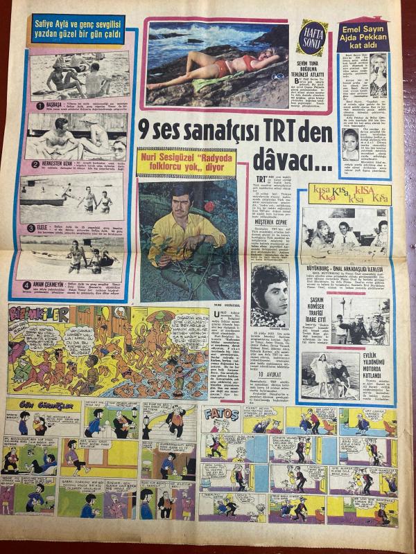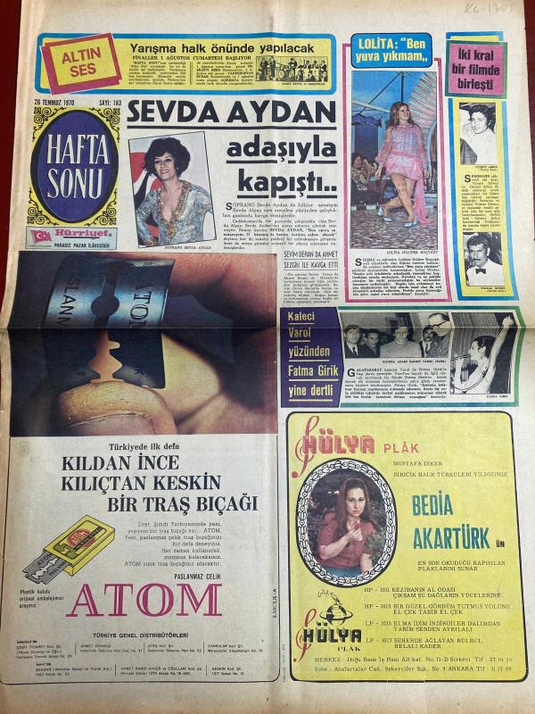 HAFTA SONU GAZETESİ DOĞUM GÜNÜ HEDİYESİ - 26 TEMMUZ 1970 - 4 SAYFADIR -Sevda Aydan-Sevda Alpay-Lolita-Hülya Koçyiğit-Ahmet Sezgin-Fatma Girik-Bedia Akartürk-Mustafa Diker-Muzaffer Akgün-Ayşe Kızılba-Belkıs Gölgeci-Saime Sinan-Neslihan-Cem Karaca-Burhan Tonguç-Nuri Sesigüzel-Safiye Ayla-Sevim Tuna-Emel Sayın-Ajda Pekkan- Sevda Aydan adaşıyla kapıştı-Lolita ben yuva yıkmam-İki kral bir filmde birleşti-Kıldan ince kılıçtan keskin bir tıraş bıçağı-Fatma Girik yine dertli-Hafif batı müziği bestekârları dernek kuruyor-Muzaffer Akgün radyoyu folklora ihanette suçladı-Saime Sinan çene estetiği yaptıracak-Ahmet Sezgin’e kayınvalide saldırdı-9 ses sanatçısı TRT’den davacı-Safiye Ayla ve genç sevgilisi yazıdan güzel bir gün çaldı-Nuri Sesigüzel Radyoda folklorcu yok diyor-Emel Sayın Ajda Pekkan’ı katladı-Sevim Tuna boğulma tehlikesi atlattı-Bizimkiler-Fatoş-Gün Görmüşler-Paris Tatili-Mercan Kolyesi Tokmuş-Ev Erkeği-Türkiye’de ve dünya’da en çok satan plaklar listesi adlı eser, Kitap > Süreli Yayınlar > Gazeteler > Türkiye > Genel > Günlük kategorisinde İkinci El olarak satıştadır.