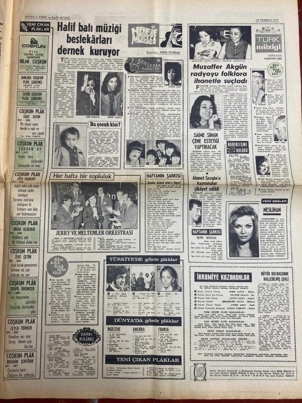 HAFTA SONU GAZETESİ DOĞUM GÜNÜ HEDİYESİ - 26 TEMMUZ 1970 - 4 SAYFADIR -Sevda Aydan-Sevda Alpay-Lolita-Hülya Koçyiğit-Ahmet Sezgin-Fatma Girik-Bedia Akartürk-Mustafa Diker-Muzaffer Akgün-Ayşe Kızılba-Belkıs Gölgeci-Saime Sinan-Neslihan-Cem Karaca-Burhan Tonguç-Nuri Sesigüzel-Safiye Ayla-Sevim Tuna-Emel Sayın-Ajda Pekkan- Sevda Aydan adaşıyla kapıştı-Lolita ben yuva yıkmam-İki kral bir filmde birleşti-Kıldan ince kılıçtan keskin bir tıraş bıçağı-Fatma Girik yine dertli-Hafif batı müziği bestekârları dernek kuruyor-Muzaffer Akgün radyoyu folklora ihanette suçladı-Saime Sinan çene estetiği yaptıracak-Ahmet Sezgin’e kayınvalide saldırdı-9 ses sanatçısı TRT’den davacı-Safiye Ayla ve genç sevgilisi yazıdan güzel bir gün çaldı-Nuri Sesigüzel Radyoda folklorcu yok diyor-Emel Sayın Ajda Pekkan’ı katladı-Sevim Tuna boğulma tehlikesi atlattı-Bizimkiler-Fatoş-Gün Görmüşler-Paris Tatili-Mercan Kolyesi Tokmuş-Ev Erkeği-Türkiye’de ve dünya’da en çok satan plaklar listesi, ORHAN OLCAY tarafından kaleme alınmıştır. Eser AHMET ERÇALIK editörlüğünde hazırlanmıştır. Kitap HÜNGÜN GAZETECİLİK VE MATBAACILIK A.Ş. tarafından yayınlanmıştır. 4 sayfadır. HAFTA SONU GAZETESİ DOĞUM GÜNÜ HEDİYESİ - 26 TEMMUZ 1970 - 4 SAYFADIR -Sevda Aydan-Sevda Alpay-Lolita-Hülya Koçyiğit-Ahmet Sezgin-Fatma Girik-Bedia Akartürk-Mustafa Diker-Muzaffer Akgün-Ayşe Kızılba-Belkıs Gölgeci-Saime Sinan-Neslihan-Cem Karaca-Burhan Tonguç-Nuri Sesigüzel-Safiye Ayla-Sevim Tuna-Emel Sayın-Ajda Pekkan- Sevda Aydan adaşıyla kapıştı-Lolita ben yuva yıkmam-İki kral bir filmde birleşti-Kıldan ince kılıçtan keskin bir tıraş bıçağı-Fatma Girik yine dertli-Hafif batı müziği bestekârları dernek kuruyor-Muzaffer Akgün radyoyu folklora ihanette suçladı-Saime Sinan çene estetiği yaptıracak-Ahmet Sezgin’e kayınvalide saldırdı-9 ses sanatçısı TRT’den davacı-Safiye Ayla ve genç sevgilisi yazıdan güzel bir gün çaldı-Nuri Sesigüzel Radyoda folklorcu yok diyor-Emel Sayın Ajda Pekkan’ı katladı-Sevim Tuna boğulma tehlikesi atlattı-Bizimkiler-Fatoş-Gün Görmüşler-Paris Tatili-Mercan Kolyesi Tokmuş-Ev Erkeği-Türkiye’de ve dünya’da en çok satan plaklar listesi adlı eser Türkçe dilindedir.
