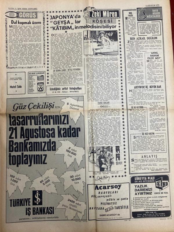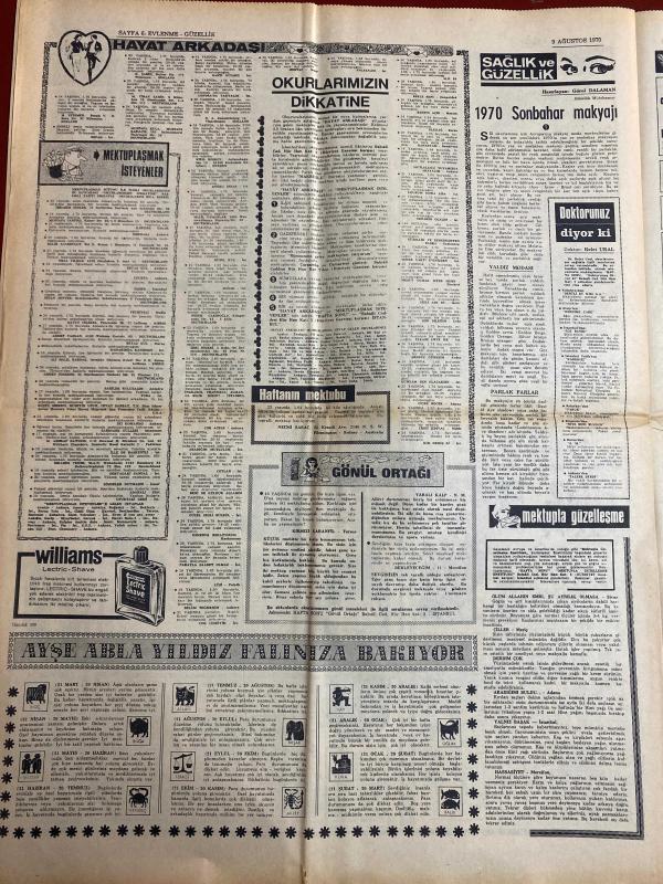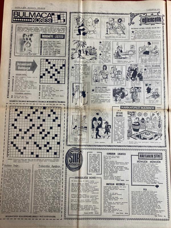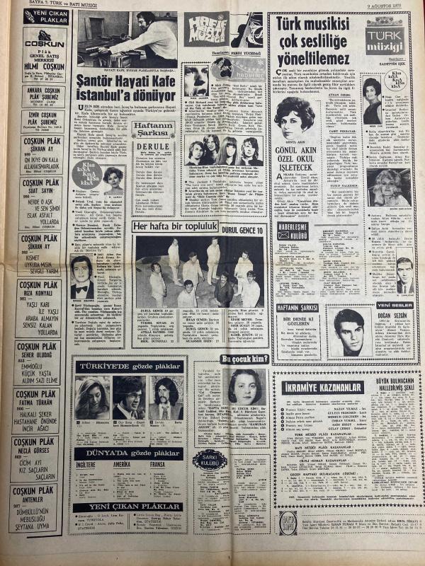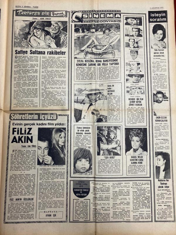 HAFTA SONU GAZETESİ DOĞUM GÜNÜ HEDİYESİ - 9 AĞUSTOS 1970 - TAM TAKIM 8 SAYFADIR -Esin Afşar-Hümeyra-M. Satır-Müjdat Gezen-Tarup-Necla Iz-Müzeyyen Senar-M. Özkul-Esat Selçuk-Rüçhan Camay-Kamuran Akkor-Sema Özcan-Ergun Bengü-Gamze Öz-Hayati Kafe-Gönül Akın-Ferdi Yodogma-Durul Gence-Doğan Sezgin-Azmi Nihad-Safiye Sultan-Sylva Koscina-Nathalie Delon-Filiz Akın-Zeki Tükel-Yul Brynner-Steve McQueen-Mirek Buchholz-Ursula Bronson-Monet Yuşich-Raquel Welch-Brigitte Bardot-Tülin Korman-Muhterem Nur-Zeki Müren-Billik- Beyaz perdeye son transferler Esin Afşar Hümeyra M. Satır-İstismar makinası Tarup yine sahnede-Necla Iz Meksikayı fethetti-Ses sanatçılarına ağır şartlar kondu-Kocasının şakası Kamuran Akkor’un ödünü patlattı-Sema Özcan’ın mücevherleri ortadan yok oldu-Gamze Öz eşinden 100 bin liraya boşanabilecek-Şantör Hayati Kafe İstanbul’a dönüyor-Türk musikisi çok sesliliğe yöneltilmez-Gönül Akın özel okul işletecek-Safiye Sultana rakibeler-Sinema Dünyası Filiz Akın-Yeni çıkan plaklar listesi, ORHAN OLCAY tarafından kaleme alınmıştır. Eser AHMET ERÇALIK editörlüğünde hazırlanmıştır. Kitap HÜNGÜN GAZETECİLİK VE MATBAACILIK A.Ş. tarafından yayınlanmıştır. 8 sayfadır. HAFTA SONU GAZETESİ DOĞUM GÜNÜ HEDİYESİ - 9 AĞUSTOS 1970 - TAM TAKIM 8 SAYFADIR -Esin Afşar-Hümeyra-M. Satır-Müjdat Gezen-Tarup-Necla Iz-Müzeyyen Senar-M. Özkul-Esat Selçuk-Rüçhan Camay-Kamuran Akkor-Sema Özcan-Ergun Bengü-Gamze Öz-Hayati Kafe-Gönül Akın-Ferdi Yodogma-Durul Gence-Doğan Sezgin-Azmi Nihad-Safiye Sultan-Sylva Koscina-Nathalie Delon-Filiz Akın-Zeki Tükel-Yul Brynner-Steve McQueen-Mirek Buchholz-Ursula Bronson-Monet Yuşich-Raquel Welch-Brigitte Bardot-Tülin Korman-Muhterem Nur-Zeki Müren-Billik- Beyaz perdeye son transferler Esin Afşar Hümeyra M. Satır-İstismar makinası Tarup yine sahnede-Necla Iz Meksikayı fethetti-Ses sanatçılarına ağır şartlar kondu-Kocasının şakası Kamuran Akkor’un ödünü patlattı-Sema Özcan’ın mücevherleri ortadan yok oldu-Gamze Öz eşinden 100 bin liraya boşanabilecek-Şantör Hayati Kafe İstanbul’a dönüyor-Türk musikisi çok sesliliğe yöneltilmez-Gönül Akın özel okul işletecek-Safiye Sultana rakibeler-Sinema Dünyası Filiz Akın-Yeni çıkan plaklar listesi adlı eser Türkçe dilindedir.