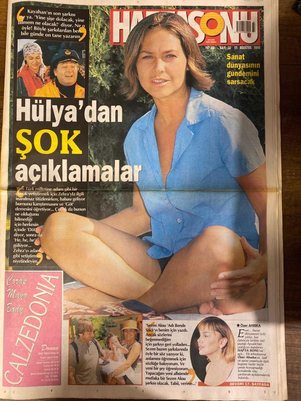 HAFTA SONU GAZETESİ DOĞUM GÜNÜ HEDİYESİ ( Turkish Newspaper ) - 11 AĞUSTOS 1999 - TAM TAKIM 20 SAYFADIR -Hülya Avşar-Kayahan-Zehra-Sezen Aksu-Özer Ahıska-Uğur Güneri-Tarkan-Orhan Gencebay-Sevim Emre-Faruk Kocabaş-Kenan Doğulu-Bülent Ersoy-Cem Adler-Şebnem Özinal-Özgür Özgülgün-Salih Keçeci-Ajda Pekkan-Adnan Şenses-Selçuk Ural-Özcan Morgül-Hülya Avşar-Harika Avcı-Çelik-Özgü Kavruk-Sonay Saygın-Barış Kocaoğlu-Şebnem Ferah-Sertab Erener-Demir Demirkan-Sibel Tüzün-Fato-Güner Ümit-Serap Aksoy-Engin Koç-Çetin Cengiz-Ebru Gündeş-Gökhan Tepe-Ebru Güleryüz-Yasemin Kozanoğlu-Yavuz Bingöl-Serdar Ortaç-Serdar Ortaç-Burcu-Ayşegül Aldinç-Melda Doğan-Ceset Tezel-Pınar Aydınlar-Tolga Sağ-Güllü-Tuğyan-Gürol Gülter-Selin Avcı-Cengiz Karavan-Özdal Aslaner-Alinç Pakel-Bilir Kocabıyık-Nükhet Doğan-Esra Balamir-Cemser Tezel-Mustafa Altıoklar-Demet Şener-Arzu Yanardağ-Nadide Sultan-Hakan Ural-Sibel Küçük, EROL SİMAVİ tarafından kaleme alınmıştır. Eser ÇETİN EMEÇ editörlüğünde hazırlanmıştır. Kitap HÜRGÜN GAZETECİLİK VE MATBAACILIK A.Ş. tarafından yayınlanmıştır. 20 sayfadır. HAFTA SONU GAZETESİ DOĞUM GÜNÜ HEDİYESİ ( Turkish Newspaper ) - 11 AĞUSTOS 1999 - TAM TAKIM 20 SAYFADIR -Hülya Avşar-Kayahan-Zehra-Sezen Aksu-Özer Ahıska-Uğur Güneri-Tarkan-Orhan Gencebay-Sevim Emre-Faruk Kocabaş-Kenan Doğulu-Bülent Ersoy-Cem Adler-Şebnem Özinal-Özgür Özgülgün-Salih Keçeci-Ajda Pekkan-Adnan Şenses-Selçuk Ural-Özcan Morgül-Hülya Avşar-Harika Avcı-Çelik-Özgü Kavruk-Sonay Saygın-Barış Kocaoğlu-Şebnem Ferah-Sertab Erener-Demir Demirkan-Sibel Tüzün-Fato-Güner Ümit-Serap Aksoy-Engin Koç-Çetin Cengiz-Ebru Gündeş-Gökhan Tepe-Ebru Güleryüz-Yasemin Kozanoğlu-Yavuz Bingöl-Serdar Ortaç-Serdar Ortaç-Burcu-Ayşegül Aldinç-Melda Doğan-Ceset Tezel-Pınar Aydınlar-Tolga Sağ-Güllü-Tuğyan-Gürol Gülter-Selin Avcı-Cengiz Karavan-Özdal Aslaner-Alinç Pakel-Bilir Kocabıyık-Nükhet Doğan-Esra Balamir-Cemser Tezel-Mustafa Altıoklar-Demet Şener-Arzu Yanardağ-Nadide Sultan-Hakan Ural-Sibel Küçük adlı eser Türkçe dilindedir.