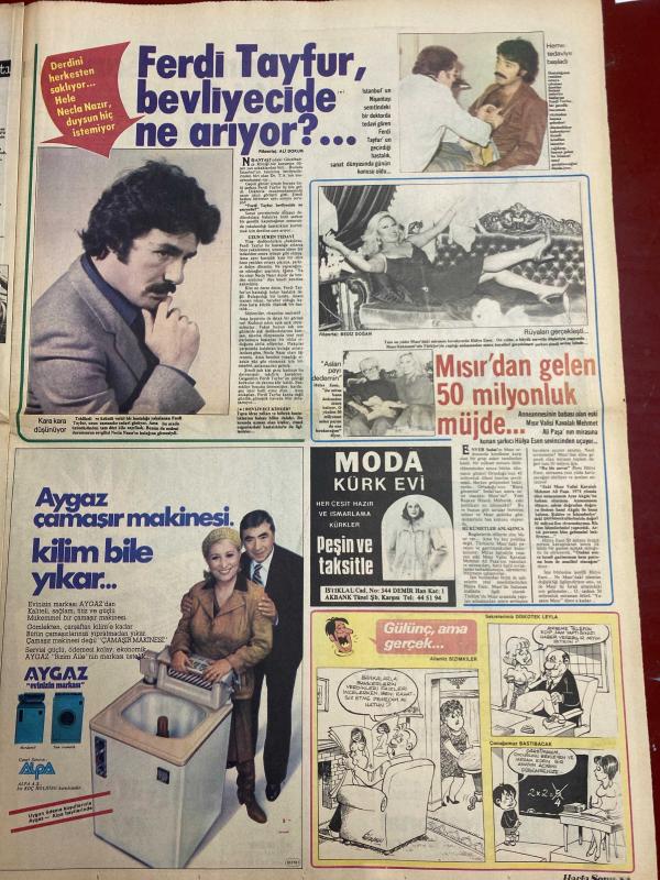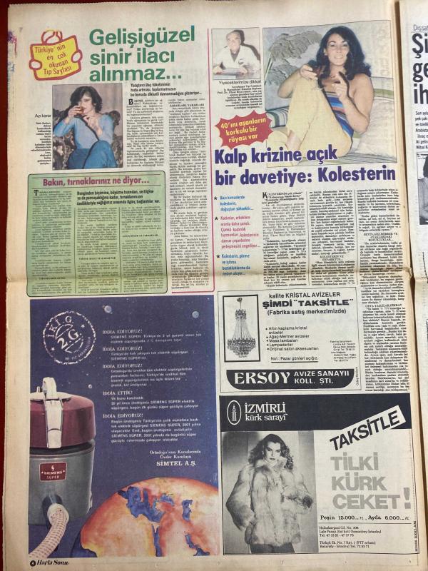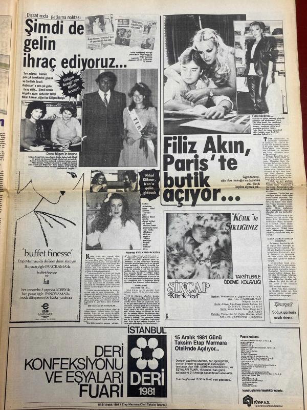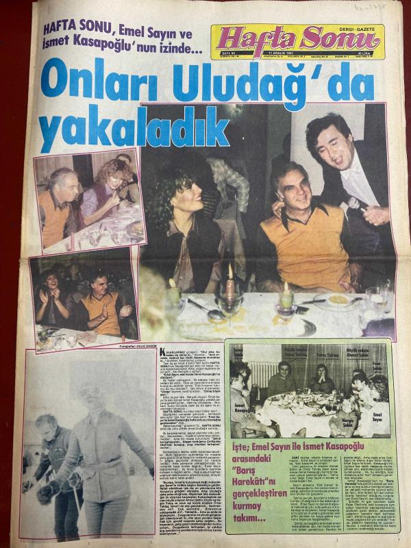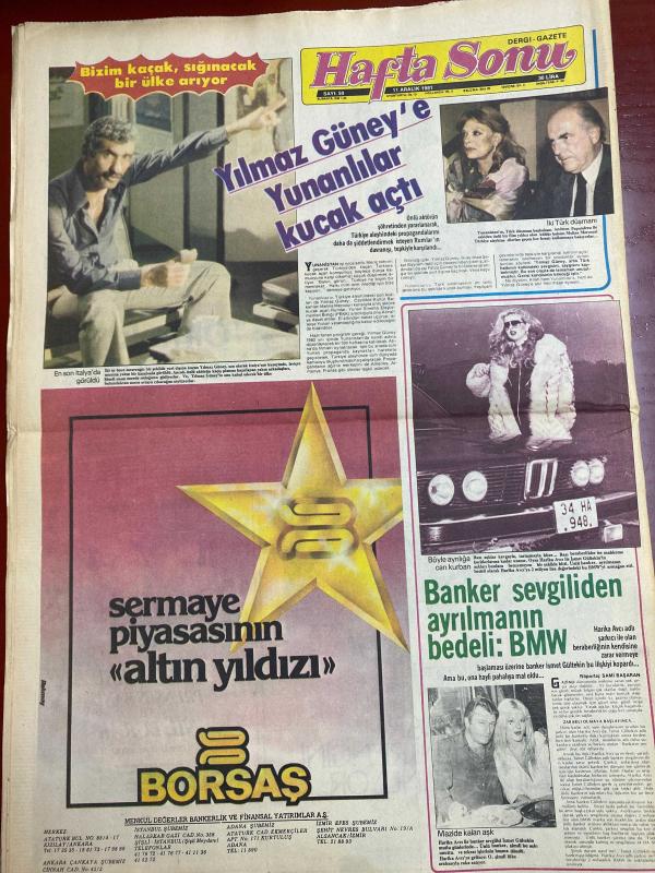 HAFTA SONU GAZETESİ DOĞUM GÜNÜ HEDİYESİ ( Turkish Newspaper ) - 11 ARALIK 1981 - TAM TAKIM 12 SAYFADIR -Emel Sayın-İsmet Kasapoğlu-Nergis Şehri-Ahmet Tahsin-Yılmaz Güney-Hazim Avcı-Türkan Şoray-Cüneyt Arkın-Rüçhan Adlı-Nilüfer-Bekir Çelenk-Filiz Akın-İlker İnanoğlu-Nihal Kıknar-Gülden Bengü-Dans Bilgen-Ferdi Tayfur-Necla Nazır-Rezge Oğan-Mehmet Ali Paşa Onları Uludağ’da yakaladık-Yılmaz Güney’e Yunanlılar kucak açtı-Banker sevgiliden ayrılmanın bedeli BMW-9 canlı adam-Erkek dediğiniz kazak olmalı-Lolita Nilüfer vicdan azabı çekiyor-Şimdi de gelin ihraç ediyoruz-Filiz Akın Paris’te butik açıyor-Ferdi Tayfur bevliyecide ne arıyor-Mısır’dan gelen 50 milyonluk müjde-Derdini herkesten saklıyor-Hele Necla Nazır duysun hiç istemiyor-Korkuların en büyüğü icra korkusu-Kocasının ilk karısı kanser Bu dostluktan maraz doğacak-Hem korkuyor hem-Bizim kaçak sığınacak bir ülke arıyor-Diplomat beyin çamaşırları-Lolita Nilüfer’in gözyaşları-“Kürk” ve şıklığınız-Kadın kadına sohbet-Gecmiş olsun-Yapı Kred, EROL SİMAVİ tarafından kaleme alınmıştır. Eser ÇETİN EMEÇ editörlüğünde hazırlanmıştır. Kitap HÜRGÜN GAZETECİLİK VE MATBAACILIK A.Ş. tarafından yayınlanmıştır. 12 sayfadır. HAFTA SONU GAZETESİ DOĞUM GÜNÜ HEDİYESİ ( Turkish Newspaper ) - 11 ARALIK 1981 - TAM TAKIM 12 SAYFADIR -Emel Sayın-İsmet Kasapoğlu-Nergis Şehri-Ahmet Tahsin-Yılmaz Güney-Hazim Avcı-Türkan Şoray-Cüneyt Arkın-Rüçhan Adlı-Nilüfer-Bekir Çelenk-Filiz Akın-İlker İnanoğlu-Nihal Kıknar-Gülden Bengü-Dans Bilgen-Ferdi Tayfur-Necla Nazır-Rezge Oğan-Mehmet Ali Paşa Onları Uludağ’da yakaladık-Yılmaz Güney’e Yunanlılar kucak açtı-Banker sevgiliden ayrılmanın bedeli BMW-9 canlı adam-Erkek dediğiniz kazak olmalı-Lolita Nilüfer vicdan azabı çekiyor-Şimdi de gelin ihraç ediyoruz-Filiz Akın Paris’te butik açıyor-Ferdi Tayfur bevliyecide ne arıyor-Mısır’dan gelen 50 milyonluk müjde-Derdini herkesten saklıyor-Hele Necla Nazır duysun hiç istemiyor-Korkuların en büyüğü icra korkusu-Kocasının ilk karısı kanser Bu dostluktan maraz doğacak-Hem korkuyor hem-Bizim kaçak sığınacak bir ülke arıyor-Diplomat beyin çamaşırları-Lolita Nilüfer’in gözyaşları-“Kürk” ve şıklığınız-Kadın kadına sohbet-Gecmiş olsun-Yapı Kred adlı eser Türkçe dilindedir.
