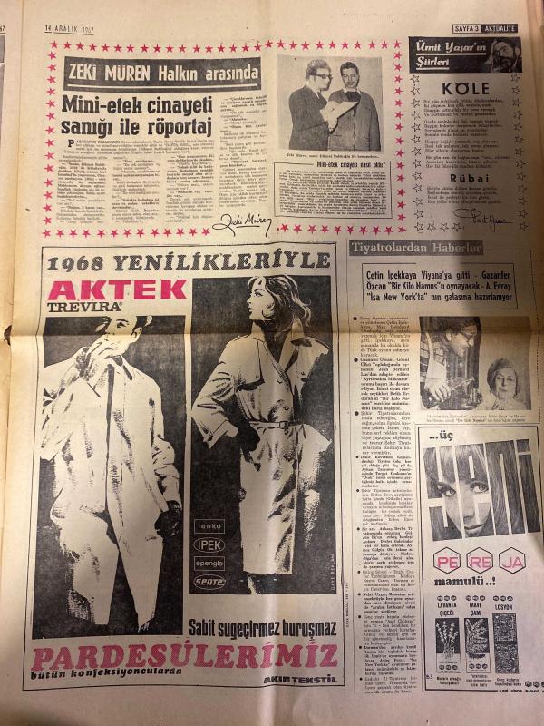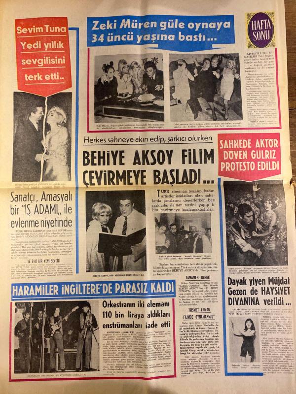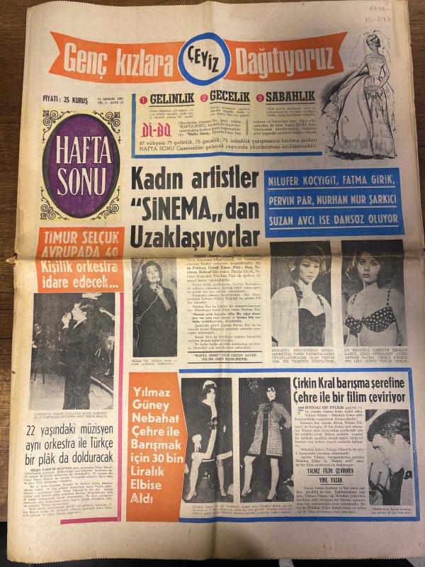 HAFTA SONU GAZETESİ DOĞUM GÜNÜ HEDİYESİ ( Turkish Newspaper ) - 14 ARALIK 1967 -TAM TAKIM 10 SAYFADIR - Yeni çıkan plaklar listesi -Nilüfer Koçyiğit-Fatma Girik-Pervin Par-Nurhan Nur-Suzan Avcı-Timur Selçuk-Yılmaz Güney-Nebahat Çehre-Zeki Müren-Sevim Tuna-Behiye Aksoy-Güzin Erdem-Müjdat Gezen-Hayriye Mutlu-Nesrin Sipahi-Hülya Süer-Ayşe Pekkan-Ruhi Su-Ada Pınar-Ayşe Yüce-Hülya Canan-Nesrin Sipahi-Mevhibe İnönü-Sophia Loren-Ira Fürstenberg-Juanito-Antonio De Ronde-Metin Ersoy-Zeynep-Fatoş Balkır-Ümit Güven-Aysun Ercan-Vedat Güleç-Ajda Pekkan-Neriman Köksal-Peri Han-Margaret Lee-Robert Stack-Peter Sellers-Arnhi Nihad-Zeki Müren-Ümit Yaşar-Tanju Okan-Fikret Hakan-Altem Bürsin-Tilven Balkan-Altem Ebru-Güner Sümer-A. Feray-Gazanfer Özcan-Mevhibe İnönü-Hikmet Dedeoğlu-Genç kızlara çeyiz dağıtıyoruz-Kadın artistler sinemadan uzaklaşıyor-Timur Selçuk Avrupa’da 40 kişilik orkestra idare edecek-Yılmaz Güney Nebahat Çehre ile barışmak için 30 bin liralık elbise aldı-Çirkin Kral barışma şerefine Ç, Ali Yılmaz tarafından kaleme alınmıştır. HAFTA SONU GAZETESİ DOĞUM GÜNÜ HEDİYESİ ( Turkish Newspaper ) - 14 ARALIK 1967 -TAM TAKIM 10 SAYFADIR - Yeni çıkan plaklar listesi -Nilüfer Koçyiğit-Fatma Girik-Pervin Par-Nurhan Nur-Suzan Avcı-Timur Selçuk-Yılmaz Güney-Nebahat Çehre-Zeki Müren-Sevim Tuna-Behiye Aksoy-Güzin Erdem-Müjdat Gezen-Hayriye Mutlu-Nesrin Sipahi-Hülya Süer-Ayşe Pekkan-Ruhi Su-Ada Pınar-Ayşe Yüce-Hülya Canan-Nesrin Sipahi-Mevhibe İnönü-Sophia Loren-Ira Fürstenberg-Juanito-Antonio De Ronde-Metin Ersoy-Zeynep-Fatoş Balkır-Ümit Güven-Aysun Ercan-Vedat Güleç-Ajda Pekkan-Neriman Köksal-Peri Han-Margaret Lee-Robert Stack-Peter Sellers-Arnhi Nihad-Zeki Müren-Ümit Yaşar-Tanju Okan-Fikret Hakan-Altem Bürsin-Tilven Balkan-Altem Ebru-Güner Sümer-A. Feray-Gazanfer Özcan-Mevhibe İnönü-Hikmet Dedeoğlu-Genç kızlara çeyiz dağıtıyoruz-Kadın artistler sinemadan uzaklaşıyor-Timur Selçuk Avrupa’da 40 kişilik orkestra idare edecek-Yılmaz Güney Nebahat Çehre ile barışmak için 30 bin liralık elbise aldı-Çirkin Kral barışma şerefine Ç adlı eser Türkçe dilindedir.