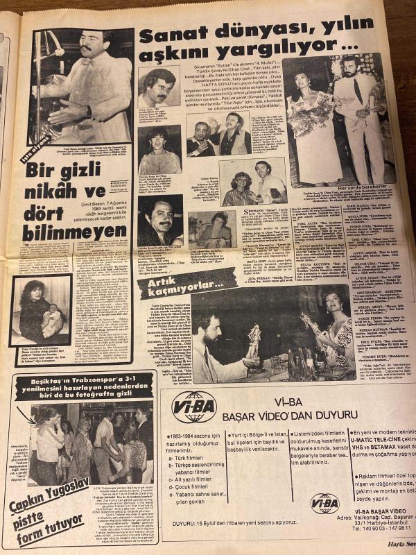HAFTA SONU GAZETESİ DOĞUM GÜNÜ HEDİYESİ ( Turkish Newspaper ) - 16 EYLÜL 1983 - TAM TAKIM 12 SAYFADIR -Hülya Koçyiğit-Melek Koçyiğit-Emel Sayın-Ajda Pekkan-Hülya Tuğlu-Faruk Peker-Hülya Avşar-Adnan Şenses-Kadir İnanır-Ümit Tokcan-Azra Balkan-Feride Karaca-Nükhet Duru-Bircan Bali-Ajda Pekkan-Orhan Gencebay-Türkan Şoray-Cihan Ünal-Ümit Besen-Hülya Avşar-İbrahim Tatlıses-Türkan Şoray-Cihan Ünal-Sevim Emre-Hülya Avşar-Ahu Tuğba Koçyiğitler’de ölüm trafiği-Anne Koçyiğit ölü gibi-Melek Koçyiğit için çifte nöbet-Ona bir şey olursa ben de ölürüm-Görünüşte dostluk-Mayolarda savaş-İlk giyen kim-Çıldırtan yakınlık-Güzele ne yaramaz-Malınız ve canınız İbo’nun güvencesinde-Süha Bey tuttuğunu altın ediyor-Sünnetçide barıştılar-Çıplak kardeşler-Devlerin gecesi-Kocasını kendi elleriyle kadınlaştıran kadın-Ahu’nun da gorilleri var-Sanat dünyası yılın aşkını yargılıyor-Bir gizli nikah ve dört bilinmeyen-Artık kaçmıyorlar, EROL SİMAVİ tarafından kaleme alınmıştır. Eser ÇETİN EMEÇ editörlüğünde hazırlanmıştır. Kitap HÜRGÜN GAZETECİLİK VE MATBAACILIK A.Ş. tarafından yayınlanmıştır. 12 sayfadır. HAFTA SONU GAZETESİ DOĞUM GÜNÜ HEDİYESİ ( Turkish Newspaper ) - 16 EYLÜL 1983 - TAM TAKIM 12 SAYFADIR -Hülya Koçyiğit-Melek Koçyiğit-Emel Sayın-Ajda Pekkan-Hülya Tuğlu-Faruk Peker-Hülya Avşar-Adnan Şenses-Kadir İnanır-Ümit Tokcan-Azra Balkan-Feride Karaca-Nükhet Duru-Bircan Bali-Ajda Pekkan-Orhan Gencebay-Türkan Şoray-Cihan Ünal-Ümit Besen-Hülya Avşar-İbrahim Tatlıses-Türkan Şoray-Cihan Ünal-Sevim Emre-Hülya Avşar-Ahu Tuğba Koçyiğitler’de ölüm trafiği-Anne Koçyiğit ölü gibi-Melek Koçyiğit için çifte nöbet-Ona bir şey olursa ben de ölürüm-Görünüşte dostluk-Mayolarda savaş-İlk giyen kim-Çıldırtan yakınlık-Güzele ne yaramaz-Malınız ve canınız İbo’nun güvencesinde-Süha Bey tuttuğunu altın ediyor-Sünnetçide barıştılar-Çıplak kardeşler-Devlerin gecesi-Kocasını kendi elleriyle kadınlaştıran kadın-Ahu’nun da gorilleri var-Sanat dünyası yılın aşkını yargılıyor-Bir gizli nikah ve dört bilinmeyen-Artık kaçmıyorlar adlı eser Türkçe dilindedir.