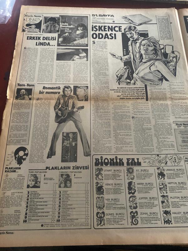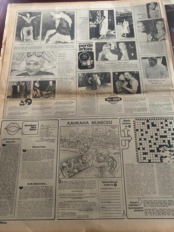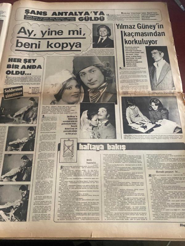 HAFTA SONU GAZETESİ DOĞUM GÜNÜ HEDİYESİ ( Turkish Newspaper ) - 18 MART 1977 -TAM TAKIM 12 SAYFADIR -Hülya Koçyiğit-Cüneyt Arkın-Rizeli Mate İsabey-Süreyya Emel Sayın-Selma Güneri-Yusuf Sezgin-Romalı Perihan-Esin Ertan-Meral Celasun-Haluk Ündeğer-Tülay-Sibel Egemen-Gülten-Bülent Ersoy-Zeki Müren-Yılmaz Güney-Fatoş Güney-Türkan Sürcan Hülya ölümden döndü-Serpil Barlas-Bülent Vural-Sevim Tuna-Huysuz Virjin-Zeki Çetin-Gamze-Ayfer Feray-Erküt Taçkın-Piraye Uzun-Meral Aydan-Nesrin Cetinel-Selim Okan-Feridun Karakaya-Linda Ronstadt-Amy Armstrong-Clinton Rogers-Kuduz iğneleri alerji yaptı-“Güneş duası nedir bilir misiniz?”-“Aşıklar diyarı”-Bu yuvayı Umut kurtardı-“Eh biz de Avrupa göreceğiz…”-Bir yılın yorgunluğu-“Tıpalarım şemsiyelerim ve kedim…”-“Bana da şans yolunu açın falcılar”-Hayal ülkesi-Gel keyfim gel-Yaz kış cildinize özel bakım gerek-Ay yine mi beni kopya-Her şey bir anda oldu-Yılmaz Güney’in kaçmasından korkuluyor-Şans Antalya’ya güldü-Saldırının sineması-Perde arkası-Dünyanın en, Ali Yılmaz tarafından kaleme alınmıştır. HAFTA SONU GAZETESİ DOĞUM GÜNÜ HEDİYESİ ( Turkish Newspaper ) - 18 MART 1977 -TAM TAKIM 12 SAYFADIR -Hülya Koçyiğit-Cüneyt Arkın-Rizeli Mate İsabey-Süreyya Emel Sayın-Selma Güneri-Yusuf Sezgin-Romalı Perihan-Esin Ertan-Meral Celasun-Haluk Ündeğer-Tülay-Sibel Egemen-Gülten-Bülent Ersoy-Zeki Müren-Yılmaz Güney-Fatoş Güney-Türkan Sürcan Hülya ölümden döndü-Serpil Barlas-Bülent Vural-Sevim Tuna-Huysuz Virjin-Zeki Çetin-Gamze-Ayfer Feray-Erküt Taçkın-Piraye Uzun-Meral Aydan-Nesrin Cetinel-Selim Okan-Feridun Karakaya-Linda Ronstadt-Amy Armstrong-Clinton Rogers-Kuduz iğneleri alerji yaptı-“Güneş duası nedir bilir misiniz?”-“Aşıklar diyarı”-Bu yuvayı Umut kurtardı-“Eh biz de Avrupa göreceğiz…”-Bir yılın yorgunluğu-“Tıpalarım şemsiyelerim ve kedim…”-“Bana da şans yolunu açın falcılar”-Hayal ülkesi-Gel keyfim gel-Yaz kış cildinize özel bakım gerek-Ay yine mi beni kopya-Her şey bir anda oldu-Yılmaz Güney’in kaçmasından korkuluyor-Şans Antalya’ya güldü-Saldırının sineması-Perde arkası-Dünyanın en adlı eser Türkçe dilindedir.