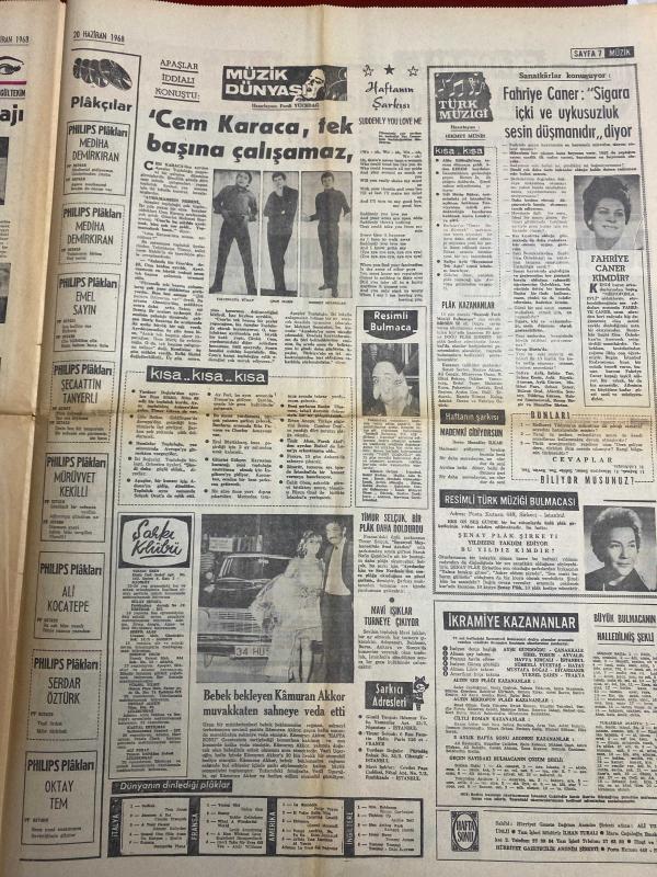 HAFTA SONU GAZETESİ DOĞUM GÜNÜ HEDİYESİ ( Turkish Newspaper ) - 20 HAZİRAN 1968 - TAM TAKIM 8 SAYFADIR -yeni çıkan plaklar listesi-Gönül Akdikmen-Zeki Çetin-Ruhan Deniz-Hülya Tüzüntürk-Vedat Çetinkaya-Nedim Utkan-Ulkan Balkar-Nevin Akcan-Serap Ergun-Hayati Engin-Berrin Menderes-Figen Say-Ünsal Aybek-Meral Küçükerol-Hülya Koçyiğit-Nilüfer Koçyiğit-Selda Alkor-Zeki Müren-Mutlu Menderes-Yüksel Menderes-Cem Karaca-Fahriye Caner-Timur Selçuk-Kamuran Akkor-Gina Lollobrigida-Vitali Hakko-Aslan Sadıkoğlu-Meral Sadıkoğlu-Canan Işık Çankaya’daki Kokteyl Skandalla Bitti-Türk Müziği Yeni Seslere Kavuştu-Türk Müziği Altın Ses Kralı Zeki Çetin-Altın Ses Kraliçesi Gönül Akdikmen-Çankaya’daki Kokteylde Gümüş Takımlar Çalındı-Berrin Menderes 2. Oğlunu Evlendiriyor-Antalya Festivali Kavga ile Son Buldu-Figen Say’ın Yeni Aşkı Bir Kunduracı-Meral Küçükerol Bir Yuvanın Yıkılmasına Sebebiyet Verdi-Hülya Koçyiğit Kardeşi Nilüfer’e İlk Gece Sahnede Yardımcı Oldu-Selda Alkor Zeki Müren’e Aşık Oldu-Cem Karaca, EROL SİMAVİ tarafından kaleme alınmıştır. Eser ÇETİN EMEÇ editörlüğünde hazırlanmıştır. Kitap HÜRGÜN GAZETECİLİK VE MATBAACILIK A.Ş. tarafından yayınlanmıştır. 8 sayfadır. HAFTA SONU GAZETESİ DOĞUM GÜNÜ HEDİYESİ ( Turkish Newspaper ) - 20 HAZİRAN 1968 - TAM TAKIM 8 SAYFADIR -yeni çıkan plaklar listesi-Gönül Akdikmen-Zeki Çetin-Ruhan Deniz-Hülya Tüzüntürk-Vedat Çetinkaya-Nedim Utkan-Ulkan Balkar-Nevin Akcan-Serap Ergun-Hayati Engin-Berrin Menderes-Figen Say-Ünsal Aybek-Meral Küçükerol-Hülya Koçyiğit-Nilüfer Koçyiğit-Selda Alkor-Zeki Müren-Mutlu Menderes-Yüksel Menderes-Cem Karaca-Fahriye Caner-Timur Selçuk-Kamuran Akkor-Gina Lollobrigida-Vitali Hakko-Aslan Sadıkoğlu-Meral Sadıkoğlu-Canan Işık Çankaya’daki Kokteyl Skandalla Bitti-Türk Müziği Yeni Seslere Kavuştu-Türk Müziği Altın Ses Kralı Zeki Çetin-Altın Ses Kraliçesi Gönül Akdikmen-Çankaya’daki Kokteylde Gümüş Takımlar Çalındı-Berrin Menderes 2. Oğlunu Evlendiriyor-Antalya Festivali Kavga ile Son Buldu-Figen Say’ın Yeni Aşkı Bir Kunduracı-Meral Küçükerol Bir Yuvanın Yıkılmasına Sebebiyet Verdi-Hülya Koçyiğit Kardeşi Nilüfer’e İlk Gece Sahnede Yardımcı Oldu-Selda Alkor Zeki Müren’e Aşık Oldu-Cem Karaca adlı eser Türkçe dilindedir.