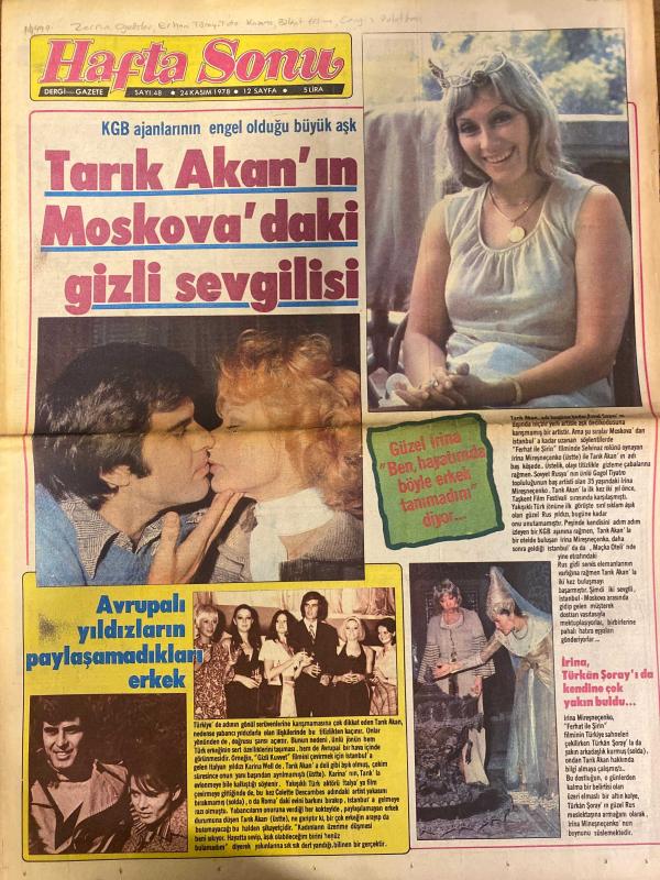 HAFTA SONU GAZETESİ DOĞUM GÜNÜ HEDİYESİ ( Turkish Newspaper ) - 24 KASIM 1978 -TAM TAKIM 12 SAYFADIR -Zerrin eğeliler-Erhan Tünay-Tuto Karaca-Cengiz Polatkan-Tarık Akan-İrina-Türkan Şoray-Gönül Kutlu-Engin Ali Kemal-Necla Nazır-Ayşe Mine-Kadir İnanır-Füsun Önal-Hülya Tuğlu-Fatma Girik-Sevim Tuna-Sevda Karaca-Sezen Aksu-Adnan Şenses-Güzide Kasacı-Perran Şensoy-Cüneyt Arkın-Elia Kazan-Filiz Akın-Bülent Ersoy-Fatoş Taner-Nilgün Atılgan-Nihat Ziyalan-Gülriz Sururi-Engin Cezzar-Tarık Akan’ın Moskova’daki gizli sevgilisi-Güzel İrina ben hayatımda böyle erkek tanımadım diyor-İrina Türkan Şoray’a kendini çok yakın buldu-Avrupalı yıldızların paylaşamadıkları erkek-Milli Takım kampında ikinci skandal-Engin’den sonra Ali Kemal-Yeni olayın yeni kahramanı ve dertli eşi-Bir aşk transferi-Mutluluğu küllerin arasında bulduk-F.B. Elif Pektaş’ın şans yolunu açtı-Vatan kurtaran aslan-Allah beni Fatma Girik’ten korudu-Bir apartman parası yiyen hastalık-Sezen Aksu’nun intiharı-Damat bey hesap veriyor-İkin, Ali Yılmaz tarafından kaleme alınmıştır. HAFTA SONU GAZETESİ DOĞUM GÜNÜ HEDİYESİ ( Turkish Newspaper ) - 24 KASIM 1978 -TAM TAKIM 12 SAYFADIR -Zerrin eğeliler-Erhan Tünay-Tuto Karaca-Cengiz Polatkan-Tarık Akan-İrina-Türkan Şoray-Gönül Kutlu-Engin Ali Kemal-Necla Nazır-Ayşe Mine-Kadir İnanır-Füsun Önal-Hülya Tuğlu-Fatma Girik-Sevim Tuna-Sevda Karaca-Sezen Aksu-Adnan Şenses-Güzide Kasacı-Perran Şensoy-Cüneyt Arkın-Elia Kazan-Filiz Akın-Bülent Ersoy-Fatoş Taner-Nilgün Atılgan-Nihat Ziyalan-Gülriz Sururi-Engin Cezzar-Tarık Akan’ın Moskova’daki gizli sevgilisi-Güzel İrina ben hayatımda böyle erkek tanımadım diyor-İrina Türkan Şoray’a kendini çok yakın buldu-Avrupalı yıldızların paylaşamadıkları erkek-Milli Takım kampında ikinci skandal-Engin’den sonra Ali Kemal-Yeni olayın yeni kahramanı ve dertli eşi-Bir aşk transferi-Mutluluğu küllerin arasında bulduk-F.B. Elif Pektaş’ın şans yolunu açtı-Vatan kurtaran aslan-Allah beni Fatma Girik’ten korudu-Bir apartman parası yiyen hastalık-Sezen Aksu’nun intiharı-Damat bey hesap veriyor-İkin adlı eser Türkçe dilindedir.