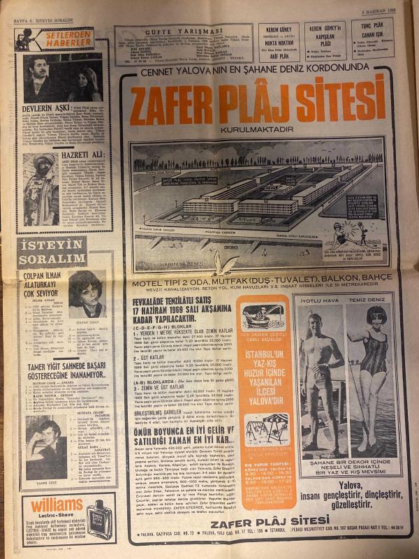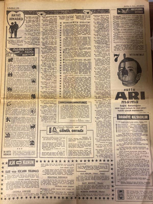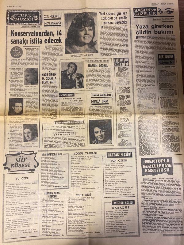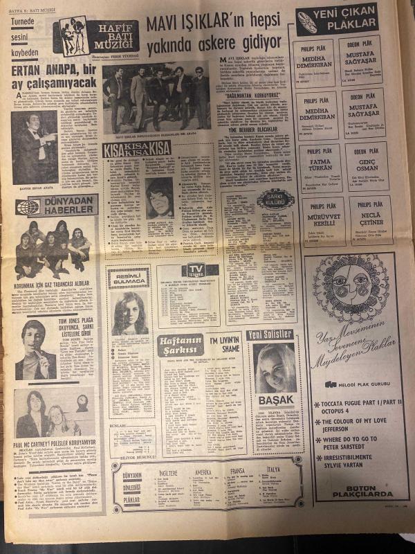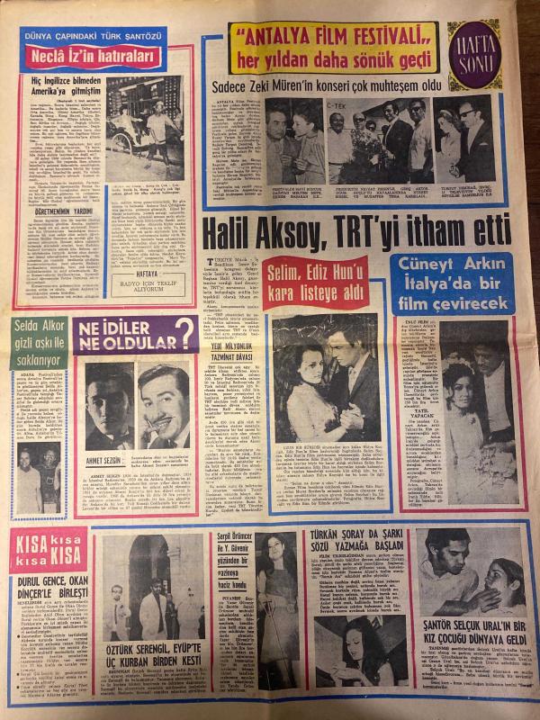 HAFTA SONU GAZETESİ DOĞUM GÜNÜ HEDİYESİ ( Turkish Newspaper ) - 5 HAZİRAN 1969 -TAM TAKIM 12 SAYFADIR -Yeni Çıkan Plaklar Listesi -Necla İz-Ayşecik-Zaliha-Lale Belkıs-İbrahim Solmaz-Selma Güneri-Gülsün Kamu-Müjden Tanrık-Yalçın Ateş-Ömer Göksel-Fatma Girik-Halil Aksoy-Selim-Ediz Hun-Cüneyt Arkın-Öztürk Serengil-Serpil Örümcer-Türkan Şoray-Yılmaz Güney-Cansel-Elçin-Selçuk Ural-Müjde Ar-Selda Alkor-Ahmet Sezgin-Durul Gence-Okan Dinçer-Müjgan Tanrıkulu-Mediha Demirkıran-Mustafa Sağyaşar-Fatma Tülek-Mürüvvet Kekilli-Necla Çetiner-Mualla Omay-İbrahim Özoral-Münir Şefik-Nazif Girgin-Müjeyyen Senar-Metin Ersoy-Müjgan Ercan-Sadi Ünver-Muzaffer Hepgüler-Zeki Müren-Safiye Filiz-Gönül Öner-Nusret Ergül-Ahmet Döner-Sayra Orkan-Necla İz’in hatıraları-Ayşecik tedavi için Amerika’ya gidiyor-Zaliha ile Lale Belkıs kavga etti-Gülsün Kamu’ya kocası iki milyonluk villa hediye etti-Fatma Girik gizlice beyaz perdeye döndü-Selma Güneri de artık şarkı söyleyecek-İran’a müzisyen akını başlıyor-Antalya Film F, Ali Yılmaz tarafından kaleme alınmıştır. HAFTA SONU GAZETESİ DOĞUM GÜNÜ HEDİYESİ ( Turkish Newspaper ) - 5 HAZİRAN 1969 -TAM TAKIM 12 SAYFADIR -Yeni Çıkan Plaklar Listesi -Necla İz-Ayşecik-Zaliha-Lale Belkıs-İbrahim Solmaz-Selma Güneri-Gülsün Kamu-Müjden Tanrık-Yalçın Ateş-Ömer Göksel-Fatma Girik-Halil Aksoy-Selim-Ediz Hun-Cüneyt Arkın-Öztürk Serengil-Serpil Örümcer-Türkan Şoray-Yılmaz Güney-Cansel-Elçin-Selçuk Ural-Müjde Ar-Selda Alkor-Ahmet Sezgin-Durul Gence-Okan Dinçer-Müjgan Tanrıkulu-Mediha Demirkıran-Mustafa Sağyaşar-Fatma Tülek-Mürüvvet Kekilli-Necla Çetiner-Mualla Omay-İbrahim Özoral-Münir Şefik-Nazif Girgin-Müjeyyen Senar-Metin Ersoy-Müjgan Ercan-Sadi Ünver-Muzaffer Hepgüler-Zeki Müren-Safiye Filiz-Gönül Öner-Nusret Ergül-Ahmet Döner-Sayra Orkan-Necla İz’in hatıraları-Ayşecik tedavi için Amerika’ya gidiyor-Zaliha ile Lale Belkıs kavga etti-Gülsün Kamu’ya kocası iki milyonluk villa hediye etti-Fatma Girik gizlice beyaz perdeye döndü-Selma Güneri de artık şarkı söyleyecek-İran’a müzisyen akını başlıyor-Antalya Film F adlı eser Türkçe dilindedir.
