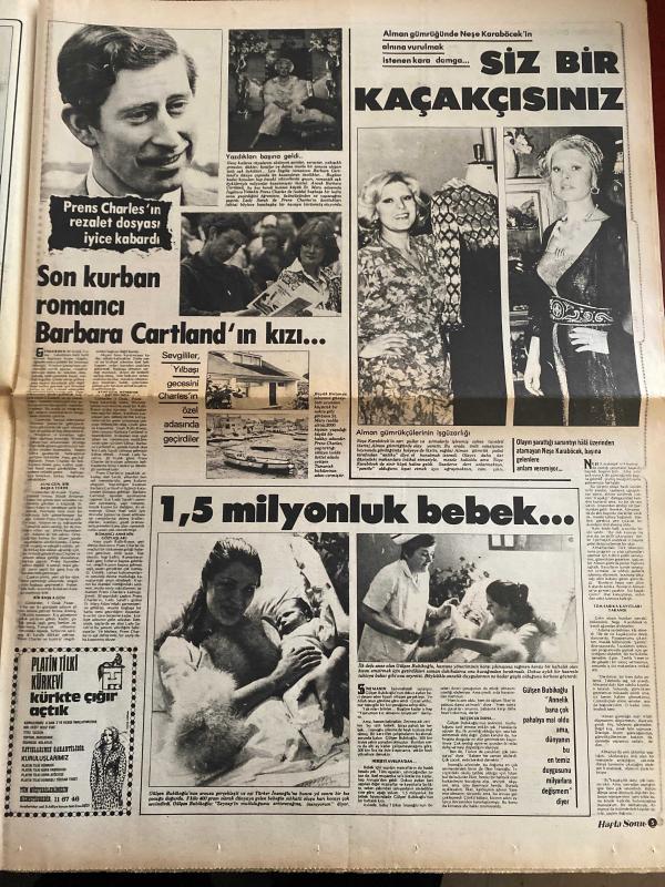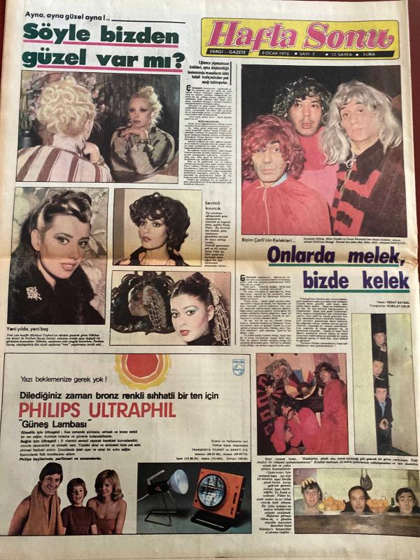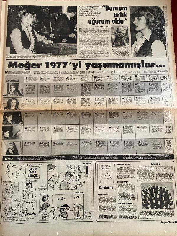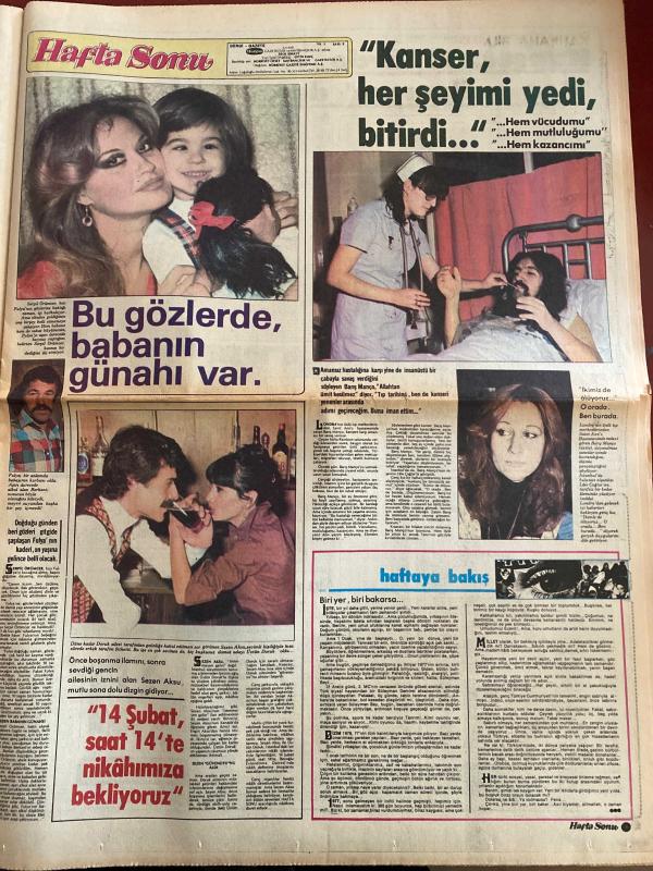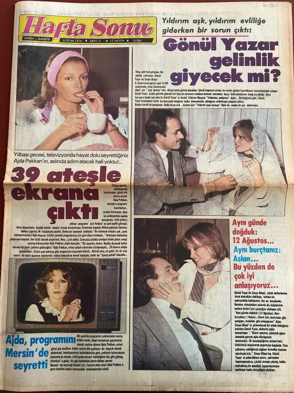 HAFTA SONU GAZETESİ DOĞUM GÜNÜ HEDİYESİ ( Turkish Newspaper ) - 6 OCAK 1978 -TAM TAKIM 12 SAYFADIR -Aydemir Akbaş-Mete inselel-Cevat Kurtuluş-Lale Çağlar-Barış Manço-Ajda Pekkan-Gönül Yazar-Sinan Bilsel-Sibel Egemen-Vedat Saygıer-Kubilay Çelik-Selahattin Kolçak-Sevilay Şen-Sadettin Ökten-Hayri Aksoy-Filiz Akın-Tayfun Yüce-Tarık Aktuğ-Ünal Kutlalı-Sibel Ergener Gönül Yazar Gelinlik Giyecek mi-Serpil Özdemir-Banu Manço-İlhan İrem-Sezen Aksu-Sibel Alaçam-Leyla Özalp-Aynur Aydan-Nazan Şoray-Prens Charles-Barbara Cartland-Neşe Karaböcek-Dilek Bubilbaşı-Gülsen Bubilbaşı-Onlarda Melek Bizde Kelek-Dargınlar Apartmanı’nın 4 Sakini-Bu Çamurlu Saçlar Artık Mizanpli-Su Tedavisi Çare mi-Sarpil Barlas’ın Tabanı Kayiyor-Göster Mimiğini Söyleyeyim Tipini-Burnum Artık Uğurum Oldu-Meğer 1977’yi Yaşamamışlar Garip Ama Gerçek-Çocukumuz-Bızdıklar-Bastıracak-Yazan ve Çizen: Adnan Egecü, Ali Yılmaz tarafından kaleme alınmıştır. HAFTA SONU GAZETESİ DOĞUM GÜNÜ HEDİYESİ ( Turkish Newspaper ) - 6 OCAK 1978 -TAM TAKIM 12 SAYFADIR -Aydemir Akbaş-Mete inselel-Cevat Kurtuluş-Lale Çağlar-Barış Manço-Ajda Pekkan-Gönül Yazar-Sinan Bilsel-Sibel Egemen-Vedat Saygıer-Kubilay Çelik-Selahattin Kolçak-Sevilay Şen-Sadettin Ökten-Hayri Aksoy-Filiz Akın-Tayfun Yüce-Tarık Aktuğ-Ünal Kutlalı-Sibel Ergener Gönül Yazar Gelinlik Giyecek mi-Serpil Özdemir-Banu Manço-İlhan İrem-Sezen Aksu-Sibel Alaçam-Leyla Özalp-Aynur Aydan-Nazan Şoray-Prens Charles-Barbara Cartland-Neşe Karaböcek-Dilek Bubilbaşı-Gülsen Bubilbaşı-Onlarda Melek Bizde Kelek-Dargınlar Apartmanı’nın 4 Sakini-Bu Çamurlu Saçlar Artık Mizanpli-Su Tedavisi Çare mi-Sarpil Barlas’ın Tabanı Kayiyor-Göster Mimiğini Söyleyeyim Tipini-Burnum Artık Uğurum Oldu-Meğer 1977’yi Yaşamamışlar Garip Ama Gerçek-Çocukumuz-Bızdıklar-Bastıracak-Yazan ve Çizen: Adnan Egecü adlı eser Türkçe dilindedir.