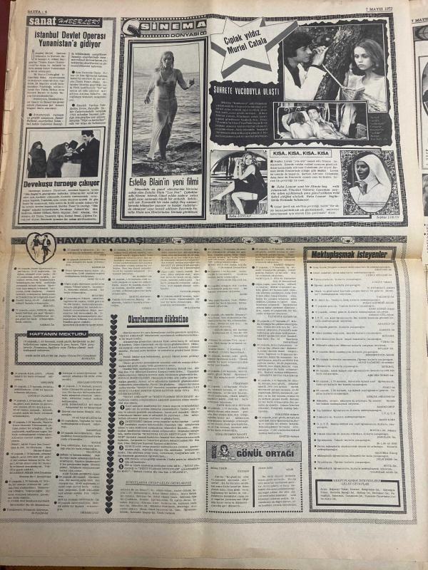 HAFTA SONU GAZETESİ DOĞUM GÜNÜ HEDİYESİ ( Turkish Newspaper ) - 7 MAYIS 1972 -TAM TAKIM 6 SAYFADIR -Nejat Uygur-Feri Cansel-Salih Güney-Kartal Tibet-Sevda Aydın-Esin Afşar-Ümit Yaşar Oğuzcan-Menderes Utku-Figen Han-Azmi Nihad-Zehra Ali-Burhan Bafralı-Estella Blain-Muriel Catala-Sophia Loren-Ajda Pekkan-Ringo Starr-Joe Cocker-Meral Atakök-Tanju Gürsu-Nilüfer Koçyiğit-Yıldırım Gürses-Aysel İpar-Seher Şeniz-Deniz Erkanat-Güven Aydın-Burhan Şevki-Gülşen Kamu-Orhan Boran Feri Cansel minibüsten düşerek yaralandı-Nejat Uygur eşini gece kulübünde dövdü-Salih Güney salon filmleri çevirmeyecek-Sevda Aydın Esin Afşar Rusya’ya gidiyor-Kartal Tibet 2 ayda 25 elbise diktirdi-Ümit Yaşar’dan şiirler-Ana koşması-Bulmaca köşesi-Pazar neşesi-Şiir köşesi-Tükeniş-Çeşitlemeler-Akvarum-Gidiş o gidiş-Görüş-Bu zihniyet yıkılmalıdır-Figen Han içki ve sigara kullanmıyor-Hançerli hanımın intikamı-Haydan gelmeyen yüzük huya gitti-Sinema dünyası-Çıplak yıldız Muriel Catala-Şöhrete vücuduyla ulaştı-Estella Blain’in, Ali Yılmaz tarafından kaleme alınmıştır. HAFTA SONU GAZETESİ DOĞUM GÜNÜ HEDİYESİ ( Turkish Newspaper ) - 7 MAYIS 1972 -TAM TAKIM 6 SAYFADIR -Nejat Uygur-Feri Cansel-Salih Güney-Kartal Tibet-Sevda Aydın-Esin Afşar-Ümit Yaşar Oğuzcan-Menderes Utku-Figen Han-Azmi Nihad-Zehra Ali-Burhan Bafralı-Estella Blain-Muriel Catala-Sophia Loren-Ajda Pekkan-Ringo Starr-Joe Cocker-Meral Atakök-Tanju Gürsu-Nilüfer Koçyiğit-Yıldırım Gürses-Aysel İpar-Seher Şeniz-Deniz Erkanat-Güven Aydın-Burhan Şevki-Gülşen Kamu-Orhan Boran Feri Cansel minibüsten düşerek yaralandı-Nejat Uygur eşini gece kulübünde dövdü-Salih Güney salon filmleri çevirmeyecek-Sevda Aydın Esin Afşar Rusya’ya gidiyor-Kartal Tibet 2 ayda 25 elbise diktirdi-Ümit Yaşar’dan şiirler-Ana koşması-Bulmaca köşesi-Pazar neşesi-Şiir köşesi-Tükeniş-Çeşitlemeler-Akvarum-Gidiş o gidiş-Görüş-Bu zihniyet yıkılmalıdır-Figen Han içki ve sigara kullanmıyor-Hançerli hanımın intikamı-Haydan gelmeyen yüzük huya gitti-Sinema dünyası-Çıplak yıldız Muriel Catala-Şöhrete vücuduyla ulaştı-Estella Blain’in adlı eser Türkçe dilindedir.