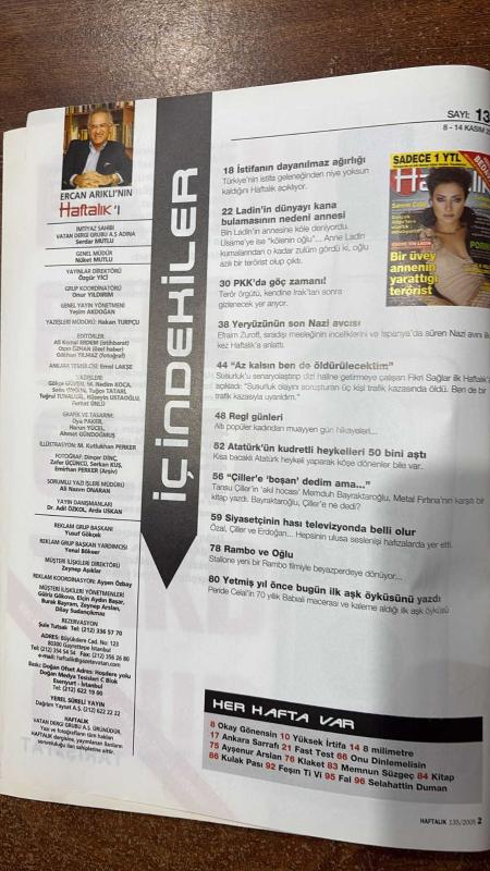 HAFTALIK HABER DERGİSİ - 8-14 KASIM 2005 SAYI: 135 USAME BİN LADİN - TANSU ÇİLLER - MEMDUH BAYRAKTAROĞLU - AURORA SNOW - EFRAIM ZUROFF - FİKRİ SAĞLAR - SİNAN ŞAMİL SAM - PERİDE CELAL - STALLONE - ÖZAL - ERDOĞAN - ATATÜRK USAME BİN LADİN ÇOCUKLUK ÖYKÜSÜ - ÇİLLER’İN KARAKUTUSU KONUŞTU - PORNO YILDIZI AURORA SNOW RÖPORTAJI - ÜNLÜ KADINLAR İLK REGL ANILARI - SON NAZİ AVCISI - SUSURLUK SENARYOSU FİKRİ SAĞLAR - ATATÜRK HEYKELLERİ - SİYASETÇİLERİN ULUSA SESLENİŞLERİ - RAMBO TEKRAR ÇEKİLİYOR - PERİDE CELAL 70 YILLIK MACERA - 96 SAYFA, SERDAR MUTLU, ERCAN ARIKLI tarafından kaleme alınmıştır. Kitap ABC TÜRKİYE tarafından yayınlanmıştır. 96 sayfadır. HAFTALIK HABER DERGİSİ - 8-14 KASIM 2005 SAYI: 135 USAME BİN LADİN - TANSU ÇİLLER - MEMDUH BAYRAKTAROĞLU - AURORA SNOW - EFRAIM ZUROFF - FİKRİ SAĞLAR - SİNAN ŞAMİL SAM - PERİDE CELAL - STALLONE - ÖZAL - ERDOĞAN - ATATÜRK USAME BİN LADİN ÇOCUKLUK ÖYKÜSÜ - ÇİLLER’İN KARAKUTUSU KONUŞTU - PORNO YILDIZI AURORA SNOW RÖPORTAJI - ÜNLÜ KADINLAR İLK REGL ANILARI - SON NAZİ AVCISI - SUSURLUK SENARYOSU FİKRİ SAĞLAR - ATATÜRK HEYKELLERİ - SİYASETÇİLERİN ULUSA SESLENİŞLERİ - RAMBO TEKRAR ÇEKİLİYOR - PERİDE CELAL 70 YILLIK MACERA - 96 SAYFA adlı eser Türkçe dilindedir.