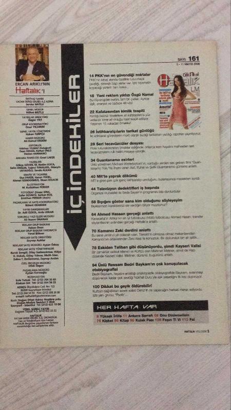 HAFTALIK HABER DERGİSİ - SAYI:161 - 5-11 MAYIS 2006 - 112 SAYFA - GİZLİ KAMERA GÖRÜNTÜLERİ - İKİ MİT'Çİ TARİKATA MÜRİD GİBİ SIZDI - ANNETTE - KIBRIS RUM KESİMİ'NİN SEKSI SESİ - YEDİ YIL NAMAZ KILDIM - SERİ TECAVÜZCÜLER DOSYASI - DÜNYANIN EN ZENGİN İKİNCİ ADAMI OLMAK İSTER MİSİNİZ - ERKEĞİN GÜVENİNİ KAYBETMEMEK İÇİN - ORGANİZE MUHALEFET GİTGİDE BÜYÜYOR - PKK'NIN EN GÜVENDİĞİ NOKTALAR - ÖZGÜ NAMAL - KAFATASINDAN KİMLİK TESPİTİ - GUANTANAMO ESİRLERİ - MİT'TE YAPRAK DÖKÜMÜ - TELEVİZYON DEDEKTİFLERİ İŞ BAŞINDA - BIYIĞINI GÖSTER SANA KİM OLDUĞUNU SÖYLEYİM - AHMED HASSAN - KEMANCI ZEKİ - MEHMET METİNER - BEDRİ BAYKAM - NÜKHET DURU - DİKKAT BU GEYİK ÖLDÜREBİLİR - DENİZ - PANİK - OKAY GÖNENSİN - DENİZ ÜNALDI - AYŞENUR ARSLAN - EMEL LAKŞE - KUTLUKHAN PERKER - SERDAR MUTLU - NÜKET MUTLU - ÖZGÜR YİCİ - ONUR YILDIRIM - HAKAN TURPCU - ALİ KEMAL ERDEM - OZAN ÖZHAN - GÖKHAN YILMAZ - FERHAT ÜNLÜ - DESTAN HARMANCI - GÖKÇE GÜVEN - M. NEDİM KOCA - SELİN ONGUN - TUĞRUL TUNALIGİL - HÜSEYİN USTAOĞLU - SEVDA adlı eser, Kitap > Süreli Yayınlar > Dergiler > Siyaset kategorisinde İkinci El olarak satıştadır.