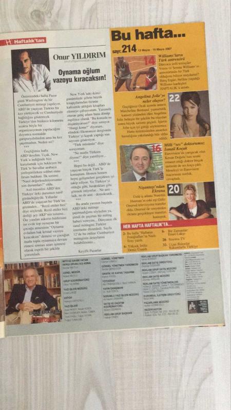 HAFTALIK - SAYI:214 - 13-19 MAYIS 2007 - 26 SAYFA - POLAT ALEMDAR'I SESLENDİREN UMUT TABAK - PELİN BATU - PELİN BATU NEDEN YAHUDİ TARİHİNİ YAZDI - KENAN DOĞULU - ANGELINA JOLIE - KENAN DOĞULU'NUN KULİSTEKİ GİZLİ SİLAHI KONUŞTU - ANGELINA JOLIE ÖLÜMCÜL HASTALIĞA MI YAKALANDI - KURTLAR VADİSİ'NİN POLAT'I KARİZMASINI UMUT'A BORÇLU - HAFTANIN FOTOĞRAFLARI - VEGETARIANS TASTE BETTER - YAPRAKLI PROTESTO - BİR NEVİ DİLEK AĞACI - BALON İÇİNDE EĞLENCE - KAHVALTI KEYFİ - CUMHURİYET MİTİNGİ ABD'DE - DÜNYANIN İLK SANAL MİTİNGİ - WILLIAMS'LARIN TÜRK ANTRENÖRÜ - ANGELINA JOLIE'YE NELER OLUYOR - NİŞANTAŞI'NDAN EKRANA - MİLLİ SES DOKTORUMUZ İSMAİL KOÇAK - BİR ZAMANLAR - SİNEMA-TV - UÇAN BALONLAR - RAKAMLARLA TÜRKİYE - YÜKSEK İRTİFA - SERDAR MUTLU - NÜKET MUTLU - ONUR YILDIRIM - EMEL LAKŞE - ERCAN ARIKLI - MELKE TOMER - DAGLI TU - TATAR TUNALGE - BARIS ERGÜN - NAZLI ERAY - OSMAN URASU - YENA BOKEER - SERDAR ŞENGOLER - HARUN YÜCEL - AP ONBAŞIOĞLU - BEN YARKIN - DR. ADİ OZKOL - ALİ NAZI, Serdar Mutlu tarafından kaleme alınmıştır. Eser Ercan Arıklı editörlüğünde hazırlanmıştır. Kitap Vatan Dergi Grubu tarafından yayınlanmıştır. 28 sayfadır. HAFTALIK - SAYI:214 - 13-19 MAYIS 2007 - 26 SAYFA - POLAT ALEMDAR'I SESLENDİREN UMUT TABAK - PELİN BATU - PELİN BATU NEDEN YAHUDİ TARİHİNİ YAZDI - KENAN DOĞULU - ANGELINA JOLIE - KENAN DOĞULU'NUN KULİSTEKİ GİZLİ SİLAHI KONUŞTU - ANGELINA JOLIE ÖLÜMCÜL HASTALIĞA MI YAKALANDI - KURTLAR VADİSİ'NİN POLAT'I KARİZMASINI UMUT'A BORÇLU - HAFTANIN FOTOĞRAFLARI - VEGETARIANS TASTE BETTER - YAPRAKLI PROTESTO - BİR NEVİ DİLEK AĞACI - BALON İÇİNDE EĞLENCE - KAHVALTI KEYFİ - CUMHURİYET MİTİNGİ ABD'DE - DÜNYANIN İLK SANAL MİTİNGİ - WILLIAMS'LARIN TÜRK ANTRENÖRÜ - ANGELINA JOLIE'YE NELER OLUYOR - NİŞANTAŞI'NDAN EKRANA - MİLLİ SES DOKTORUMUZ İSMAİL KOÇAK - BİR ZAMANLAR - SİNEMA-TV - UÇAN BALONLAR - RAKAMLARLA TÜRKİYE - YÜKSEK İRTİFA - SERDAR MUTLU - NÜKET MUTLU - ONUR YILDIRIM - EMEL LAKŞE - ERCAN ARIKLI - MELKE TOMER - DAGLI TU - TATAR TUNALGE - BARIS ERGÜN - NAZLI ERAY - OSMAN URASU - YENA BOKEER - SERDAR ŞENGOLER - HARUN YÜCEL - AP ONBAŞIOĞLU - BEN YARKIN - DR. ADİ OZKOL - ALİ NAZI adlı eser Türkçe dilindedir.