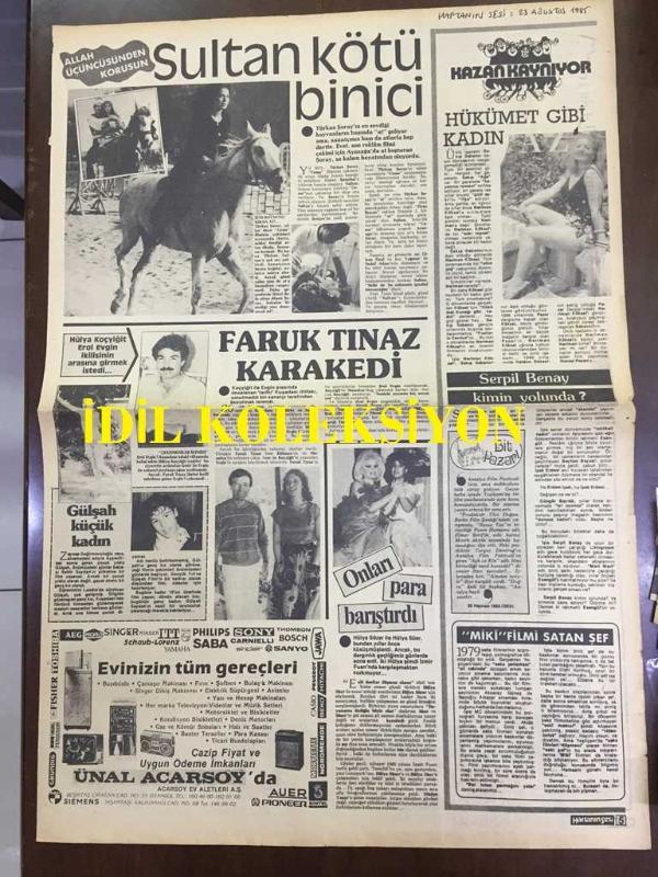 HAFTANIN SESİ GAZETESİ, 23 AĞUSTOS 1985 (TEK YAPRAK, 2 SAYFA) - TÜRKAN ŞORAY REKLAM FİLMİ İÇİN AYAZAĞA'DA BİNDDİĞİ ATTAN DÜŞTÜ - FARUK TINAZ - GÜLŞAH - ÜNAL ACARSOY - GÖNÜL YAZAR - EROL EVGİN, HÜLYA KOÇYİĞİT - ÇAVUŞOĞLU AİLESİ - FİGEN & ÜNVER ORAL - CEM PATPAT - NİHAT TANFER - TUĞRUL & LEYLA BELLİ - DEMİR BUDAK - ESRA BAŞKAYA - NEVİN GÜVENÇ - NÜKET SANDALLI - MERT KERİMİ - OYA BENTÜRK adlı eser Türkçe dilindedir.