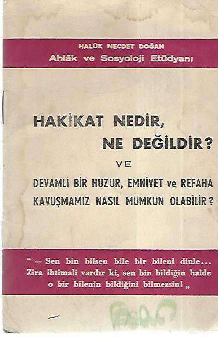 HAKİKAT NEDİR NE DEĞİLDİR VE DEVAMLI BİR HUZUR EMNİYET VE REFAHA KAVUŞMAMIZ NASIL MÜMKÜN OLABİLİR, HALUK NECDET DOĞAN tarafından kaleme alınmıştır. Kitap ARI MATBAASI tarafından [İSTANBUL] yayınlanmıştır. 30 sayfadır. HAKİKAT NEDİR NE DEĞİLDİR VE DEVAMLI BİR HUZUR EMNİYET VE REFAHA KAVUŞMAMIZ NASIL MÜMKÜN OLABİLİR adlı eser Türkçe dilindedir.