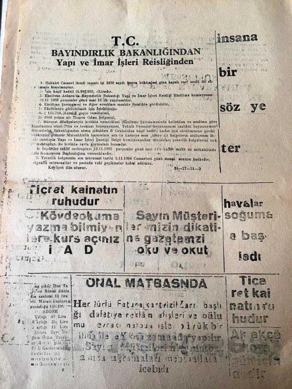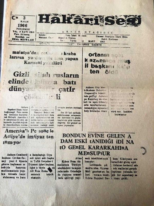 HAKKARİ HAKARİ SESİ YEREL TAŞRA BASINI - 3 Kasım 1966 -YIL :3 SAYI :1253-Amerikalı personellere adliyede imtiyaz tanınmıyor - Bondun evine gelen adam eski tanıdığı Nato genel karargahına mensuptur- T.C Bayındırlık Bakanlığından Yapı ve İmar İşleri Reisliğinden - Yıpranma, sararmalar, kupon kesiği ve yırtılmalar zamana bağlı olarak görülebilir.