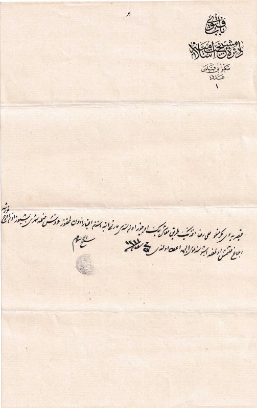 HÂLİDEFENDİZÂDE MEHMED CEMÂLEDDİN EFENDİ (Şeyhülislâm) (1848-1917) - El yazması (Güzel hatlı) Şeyhülislâm imza ve mühürlü, 1311 [1895] tarihli, “Bâb-ı Fetvâ Daire-i Meşîhât-ı İslâmiye” antetli kağıda Kayseriyye’de kerametlü Ali Rıza Efendinin maaşı ile ilgili Osmanlıca yazı “Bâb-ı Fetvâ Daire-i Meşîhât-ı İslâmiye” antetli kağıda siyah mürekkep, sim dökülmüş, 27,5x17,5 cm, Osmanlıca, kat yerleri haricinde çok temiz, el yazısı kısımlar iki satır. Tarih: fî 27 Şaban sene 1311 [1895]. Metin transkripsiyonu: "Kayseriye'de kerâmetlü Ali Rıza Efendi'nin tarik-i maaşı Bin Üçyüz On senesi martı ibtidâsından itibâren on dokuz kuruş (?) beşyüz onüç kuruş iblâğ kılınmış olmakla işbû sened itâ kılına. Fî 27 Zilhicce sene 1311 [1895]. Şeyhülislâm [Mühür]". Mehmed Cemaleddin Efendi (1848-1917) Osmanlı din adamı, şeyhülislam ve hukukçusu. Şeyhülislamlığı II. Abdülhamid dönemiyle özdeşleşmiştir. Cemaleddin Efendi, 1848 yılı civarında İstanbul'da doğdu. Babası, Şeyh Ahmed Halid Efendi de bir hukukçuydu ve hem Kazasker hem de Bakan olarak hizmet etmişti. Annesi Kevabibiye ailesindendi ve Mehmed Said Efendi'nin kızıydı. Cemalledin Efendi Osmanlı ve İslam Hukuku konusunda eğitim aldı ve Osmanlı devletine 1884'te İstanbul Kadısı olarak hizmet etti. Hemen ardından 1888'de Anadolu Kazaskerliği'ne ve 1890'da da Rumeli Kadılığı'na getirildi. 4 Eylül 1891'de 43 yaşında Şeyhülislam oldu. 16 yıl ve 11 ay bu görevde kaldı ve ardından bir kez daha kısa süreyle bu göreve getirilmesi sebebiyle toplam 18 yıla yakın bir süre bu görevde kalarak Zenbilli Ali Efendi'nin ardından tarihte, bu görevi en uzun süre yapan üçüncü kişi oldu. Ünlü operatör doktor ve belediye reisi Cemil Topuzlu kendisinin damadıdır. II. Abdülhamid'e bir soru sorması üzerine Abdülhamit'i şans eseri Yıldız Suikastı saldırısından kurtarmış olmuştur. İttihat ve Terakki Partisi'nin Alman yanlısı ve savaş destekçisi politikalarına karşı çıktığı için 1913 yılında Mısır'a sürüldü ve İskenderiye'ye yakın Ramleh şehrinde 5 Nisan 1917'de 69 yaşında öldü. Naaşı İstanbul'a getirilerek Topkapı Sarayı'na kondu, sonra İstanbul'daki Edirnekapı Şehitliği'ne defnedildi. Hatıraları ilk kez İstanbul'da 1920'de basılmıştır. Daha sonra 1990 yılında Latin alfabesiyle "Siyasi Hatıralarım" başlığı altında tekrar yayınlandı. (Vikipedi). -- Osmanlı Hukuk tarihi Otograf Koleksiyon Osmanlı dönemi ünlüleri İmza Koleksiyonu