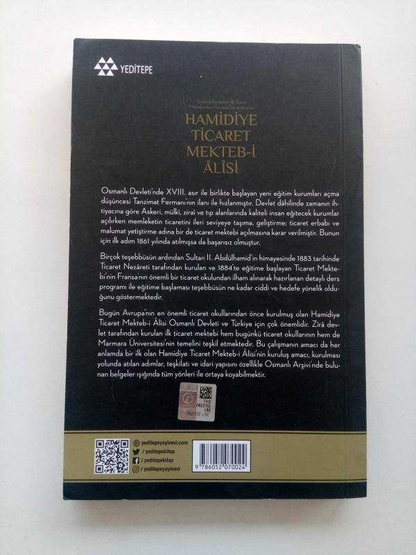 HAMİDİYE TİCARET MEKTEB-İ ALİSİ (OSMANLI DEVLETİ'NİN İLK TİCARET MEKTEBİNDEN MARMARA ÜNİVERSİTESİ'NE) (2. EL), AYŞENUR ERDOĞAN tarafından kaleme alınmıştır. Eser SAHURE ERGÜZEL editörlüğünde hazırlanmıştır. Kitap 2018 yılında YEDİTEPE YAYINEVİ YAYINLARI tarafından [ İSTANBUL] 978-605-207-002-4 ISBN kodu ile yayınlanmıştır. Satışta olan kitap, yayınevinin 1. baskısıdır. 240 sayfadır. Sayfa bilgisi 2. HAMUR olarak belirtilmiştir. HAMİDİYE TİCARET MEKTEB-İ ALİSİ (OSMANLI DEVLETİ'NİN İLK TİCARET MEKTEBİNDEN MARMARA ÜNİVERSİTESİ'NE) (2. EL) adlı eser Türkçe dilindedir.
