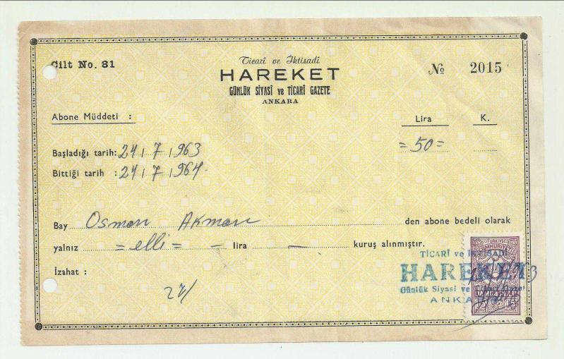 ** HAREKET GÜNLÜK SİYASİ VE TİCARİ GAZETE ** Abonelik bedeli olarak düzenlenmiş, altta bir adet damga pullu,Osman Akman adına kesilmiş makbuzdur...