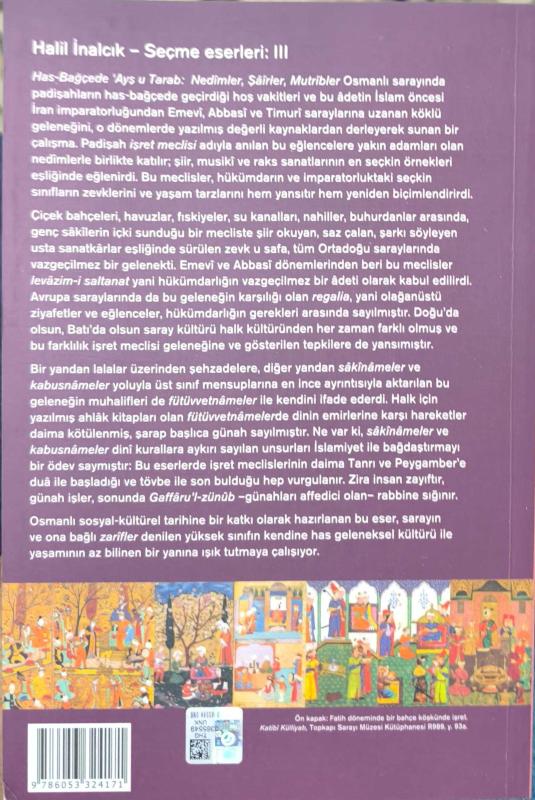 HAS-BAĞÇEDE 'AYŞ U TARAB - Nedimler Şairler Mutribler, Halil İnalcık tarafından kaleme alınmıştır. Kitap 2025 yılında Türkiye İş Bankası Kültür Yayınları tarafından [İstanbul] yayınlanmıştır. 496 sayfadır. HAS-BAĞÇEDE 'AYŞ U TARAB - Nedimler Şairler Mutribler adlı eser Türkçe dilindedir.