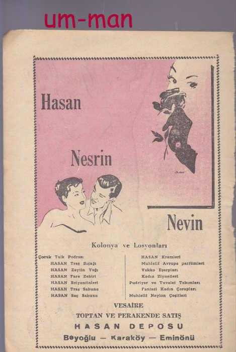 HASAN NESRİ KOLONYALARI REKLAM SAYFASI 1953 başlıklı ürün, Efemera, Müzik, Sinema > Kurum/Reklam Malzemeleri > Kozmetik, Bakım Ürünleri Reklamları kategorisi altında İkinci El olarak satılmaktadır.