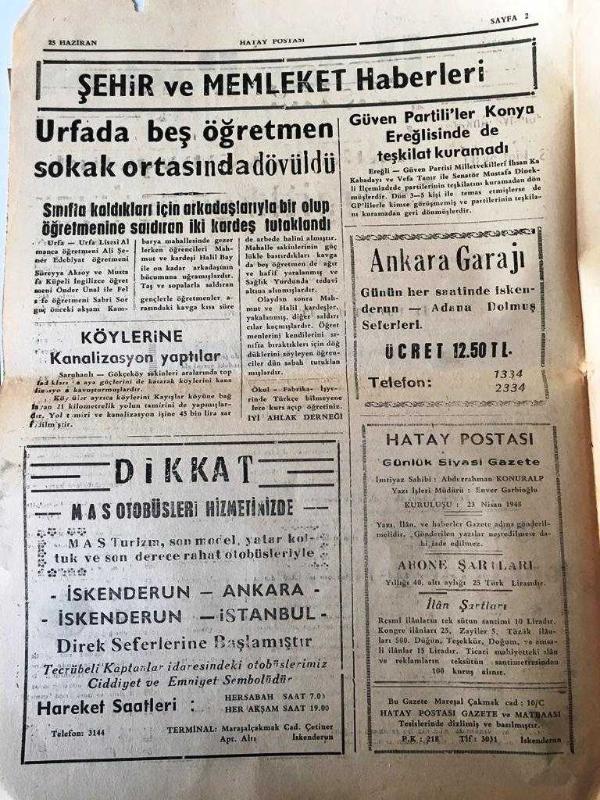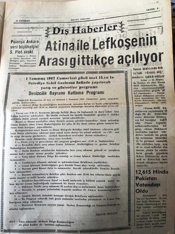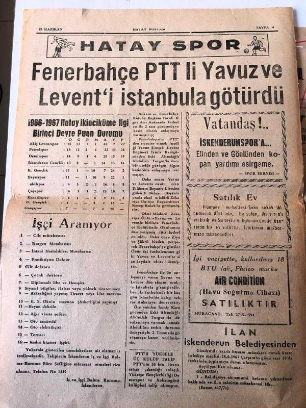 HATAY POSTASI GAZETESİ SİYASİ YEREL TAŞRA BASINI - - 25 HAZİRAN 1967- YIL :20 SAYI :5696- Özel Yatırım Bankası Tasarısı Meclis 'e Geldi - -DEGAULLE: Vietnam İşinde Rusya da Suçlu dedi - Bir Diplomata Göre - İsrail , İşgalindeki Toprakları Geri Verecek -Batı Almanya Birleşmiş Milletlere Girmek İstemiyor --Günün Yazısı - Nerden Nereye ...Arif YILMAZ--- Şehir ve Memleket Haberleri -Urfa da beş öğretmen sokak ortasında dövüldü - Köylerine Kanalizasyon Yaptılar - Güven Partililer Konya Ereğli de de Teşkilat Kuramadı -Dış Haberler : Atina ile Lefkoşe'nin Arası Gittikçe Açılıyor -Polonya Ankara Yeni Büyükelçi S.Piot . OVSKİ -12,615 Hindu Pakistan Vatandaşı Oldu - Hatay spor .- Fenerbahçe PTT Yavuz ve Levent 'i İstanbul ' a Götürdü Yıpranma, sararmalar, kupon kesiği ve yırtılmalar zamana bağlı olarak görülebilir.