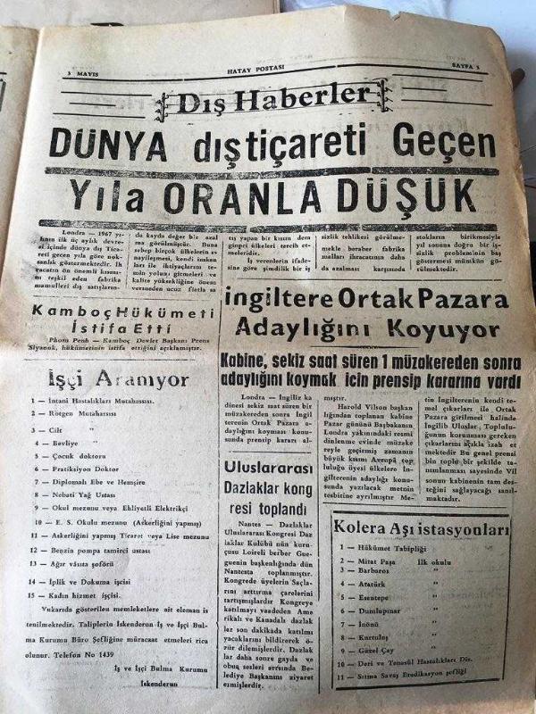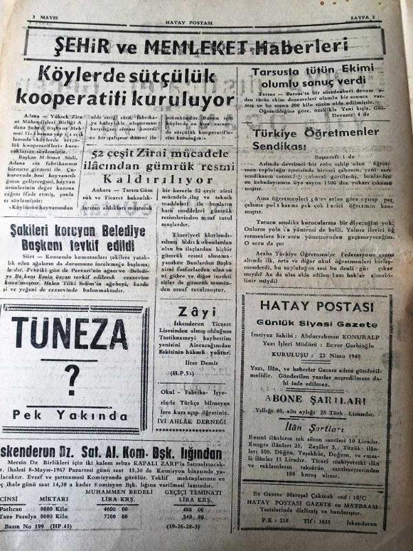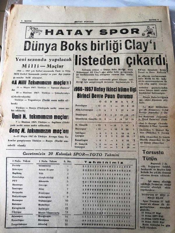 HATAY POSTASI GAZETESİ SİYASİ YEREL TAŞRA BASINI - 3 MAYIS 1967- YIL :20 SAYI :5644- Lüks Eşyadan Vergi Alınacak - Hastalıklar otamatik olarak teşhis edilecek - Şehir ve Memleket Haberleri : Köylerde sütçülük kooperatifi kuruluyor - Tarsus ta tütün ekimi olumlu sonuç verdi - Türkiye Öğretmenler Sendikası - Dış Haberler - Dünya dış ticareti geçen yıla oranla düşük - İngiltere Ortak Pazara Adaylığını Koyuyor -Uluslararası Dazlaklar Kongresi Toplandı - Hatay Spor -- Dünya Boks Birliği Clay 'ı Listeden Çıkardı - 1966-1967 Hatay ikinci küme ligi birinci devre puan durumu Yıpranma, sararmalar, kupon kesiği ve yırtılmalar zamana bağlı olarak görülebilir.