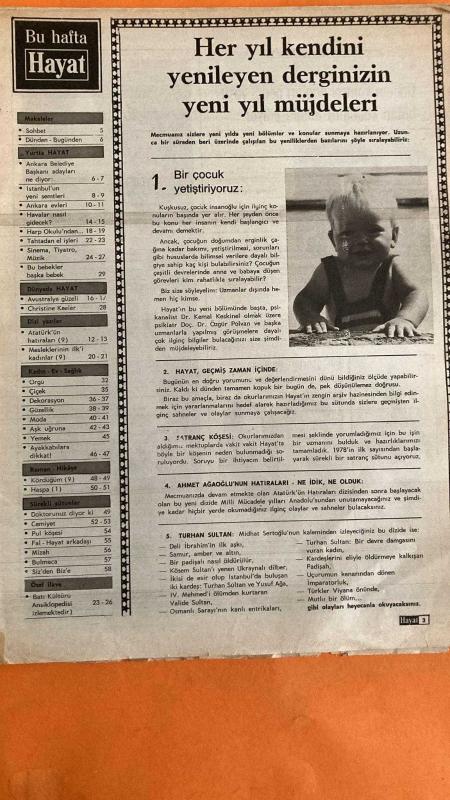 HAYAT DERGİSİ - 8 ARALIK 1977 KAPAK : MÜJDE AR – ALİ DİNÇER – VEDAT ALİ ÖZKAN – ANKARA BELEDİYE SEÇİMLERİ - POSTER : ÇİÇEKLER - ANKARA’DA VAATLER – HAVA KİRLİLİĞİ – KONUT SORUNU – METRO PROJESİ – YEŞİL PARKLAR – SEMT SPOR SAHALARI – YENİ YIL MÜJDELERİ – HAYAT DERGİSİ – ATATÜRK’ÜN HATIRALARI – AHMET AĞAOĞLU – TURHAN SULTAN – MİDHAT SERTOĞLU – OSMANLI SARAYI – DÜNYANIN EN BÜYÜK SUNİ İNCİSİ – MAÇİKO KUMABE – NEW YORK İNCİ SERGİSİ – SİGARA BIRAKTIRAN ELLER – WALTER PFISTER – KALKINMA YERİNE TOPARLANMA – ŞEVKET RADO – CİHAT BİLGEHAN – 1978 BÜTÇESİ – NÜFUS PLANLAMASI – TÜRKİYE EKONOMİSİ – SANAYİLEŞME – ENERJİ SIKINTISI – FİYAT ARTIŞLARI – ANARŞİ – KIBRIS DAVASI – BATI KÜLTÜRÜ ANSİKLOPEDİSİ – SİNEMA – TİYATRO – MÜZİK – MODA – GÜZELLİK – DEKORASYON – YEMEK – ROMAN – HİKÂYE – SATRANÇ KÖŞESİ – DOKTORUNUZ DİYOR Kİ – CEMİYET – PUL KÖŞESİ – FAL – MİZAH – BULMACA – 28 SAYFA adlı eser Türkçe dilindedir.
