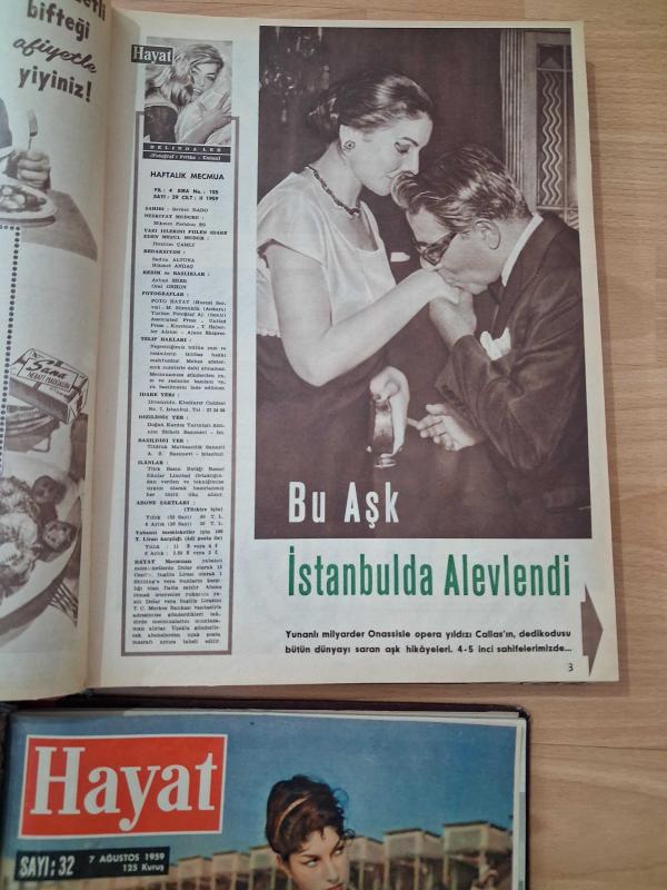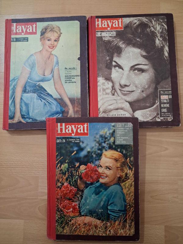 HAYAT MECMUASI 1959, Sayı:1-17 ( 17 Sayı ) , CİLDİNDE ÖN TARAFTAN AYRILMA BAŞLAMIŞ, KAPAK BİRAZ DEFORME, 1. SAYININ CİLTLE BİRLEŞTİĞİ YERDE SORUN VAR, DERGİLER SAĞLIKLI. 10. SAYININ KAPAĞI, CİLT KAPAĞINDA. SAYILAR:1-2-3-4-5-6-7-8-9-10-11-12-13-14-15-16-17 POSTERLER: ATATÜRK, TEVFİK FİKRET, RUBENS '' PARİS'İN KARARI'', KAZIM KARABEKİR, TURGUT REİS, MALİK AKSEL ''NUH TUFANI'' , FENERBAHÇE, BAŞVEKİL ADNAN MENDERES, GALATASARAY, ORTAOYUNU ''RESSAM MUAZZEZ'' , EYÜP SULTAN CAMİİ, HIRKAİ ŞERİF CAMİİ, GALATA KÖPRÜSÜ ''R. RINGENBACH'' , BİR İSTANBUL TABLOSU.... POSTERLER TAMAM, EKSİK YOK, HAYAT MECMUASI 1959, Sayı:18-35 ( 18 Sayı ), KAPAK BİRAZ DEFORME, CİLD HAFİF ZAYIFLAMIŞ, ÇOK AZ SAYIDA SAYFA SIRTINDA HAFİF SORUNLAR VAR, DERGİLER SAĞLIKLI. 24. SAYININ KAPAĞI, CİLT KAPAĞINDA. SAYILAR:18-19-20-21-22-23-24-25-26-27-28-29-30-31-32-33-34-35 POSTERLER: ATATÜRK, BARBAROS KANUNİ HUZURUNDA, FİGEN ÖZGÜR, FATİH, HALİL ADALI, ESKİKAĞITHANE, MODA KOYU DENİZCİLİK BAYRAMI, KANLICA SIRTLARINDAN BOĞAZİÇİ .... 25. SAYININ POSTERİ CİLTTEN AYRILMIŞ ( KOÇ KAHVESİ ''NAZMİ ZİYA'') POSTER ÇEVRESİNDE SORUNLAR VAR. POSTERLER TAMAM, EKSİK YOK, HAYAT MECMUASI 1959, Sayı:36-52 ( 16 Sayı ), KAPAK BİRAZ DEFORME, ÖN TARAFTAN CİLTTE AYRILMA BAŞLAMIŞ, ÇOK AZ SAYIDA SAYFANIN ÇEVRESİNDE HAFİF SORUNLAR VAR, DERGİLER SAĞLIKLI. 42. SAYININ KAPAĞI, CİLT KAPAĞINDA. SAYILAR:36-37-38-39-40-41-42-43-44-45-46-47-48-49-50-51-52 POSTERLER: MONA LİSA, MAVİLİ ÇIPLAK KIZ, BURSA SÜLEYMAN ÇELEBİ TÜRBESİ, ERTUĞRUL FİRKATEYNİ JAPON SULARINDA, HAYDARPAŞA GARI, ATATÜRK, NURUOSMANİYE CAMİİ, MEVLANA'NIN İLK SEMAĞI, İSTANBUL'A GİRİŞ.... 50-51-52. SAYILARDA '' FARAH DİBA'' HABERLERİ VAR. 47. SAYI POSTERİ EKSİK. POSTERLER 1 EKİSİK TAMAM.