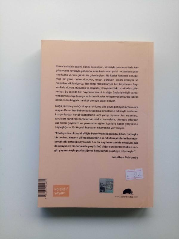 “Geyikler, yabandomuzları ya da kargaların, kendi içinde mükemmel olan hayatlarını yaşarken eğlenebildiklerini de kavrayan biri, kadim ormanlardaki yapraklar arasında neşeyle dolaşan o minik hortumluböceklerine de saygı duyabilir belki.” Kimisi evimizin sakini, kimisi sokakların, kimisiyle penceremizde karşılaşıyoruz kimisiyle yabanda, ama kesin olan şu ki ne zaman seslerine kulak versek günümüz güzelleşiyor. Ne kadar farkında olduğumuz bir yana onları duyuyor, onları görüyor, onları etkiliyor ve onlardan etkileniyoruz. Bu kitap farklılıklarıyla bizi büyüleyen hayvanlarla duygu, düşünce ve değerler dünyamızdaki ortaklıkları gösteriyor. Bu sayede bizi hayvanlar âleminin diğer üyeleriyle ilgili varsayımlarımızı sorgulamaya ve bizimki kadar kırılgan yaşamlarına iştirak ederken bu bilgiyle hareket etmeye davet ediyor. Doğa üzerine yazdığı kitapları onlarca dile çevrilip milyonlarca okura ulaşan Peter Wohlleben bu kitabında birbirlerine adlarıyla seslenen kuzgunlardan kendi yaptıklarına kafa yorup pişman olan sıçanlara, tavukları kandıran horozlardan sadık domuzlara, utangaç atlardan yas tutan geyiklere ve yavrularını eğiten keçilere kadar yeryüzünü paylaştığımız türlü çeşit hayvanın hikâyesine yer veriyor. “Etkileyici ve okunaklı diliyle Peter Wohlleben’ın bu kitabı da başka bir cevher. Yazarın bilimsel keşiflerle kendi deneyimlerini harmanlamaktaki ustalığı sayesinde her bir sayfasını zevkle okudum. Siz de okuyun ve bir daha asla yeryüzünü diğer canlıların renkli ve zengin yaşamlarıyla paylaştığımız konusunda şüpheye düşmeyin.” Jonathan Balcomb