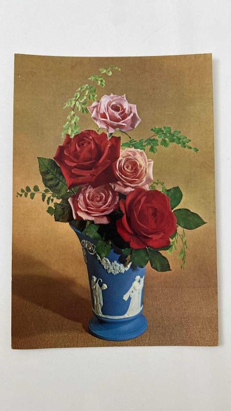 HEDİYE KARTPOSTALI - 15 x 10 cm EBADINDA - ARKASI YAZILI - BÜYÜK KIRMIZI GÜLLER,PEMBE GÜLLER VE MAVİ HEYKEL DESENLERİN OLDUĞU VAZO, 8 ay önce satışa sunulmuştur.