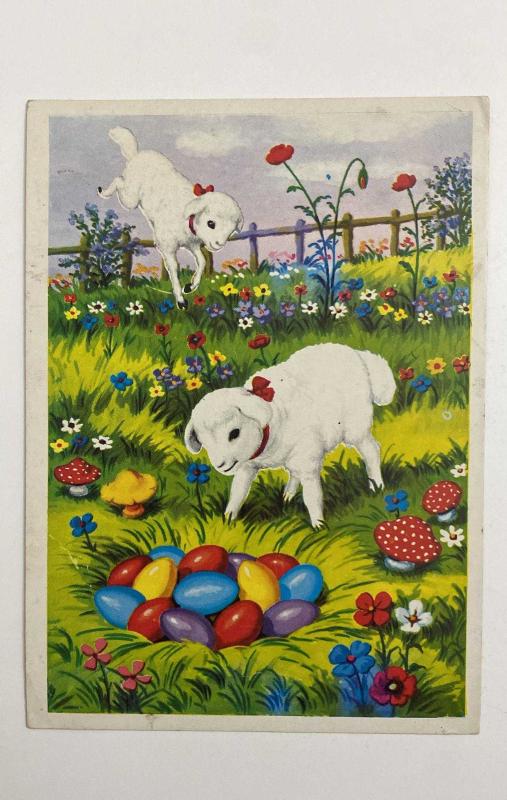 HEDİYE KARTPOSTALI - 15 x 10 cm EBADINDA - ARKASI YAZILI - YEŞİLLİKLER ARASINDA RENKLİ PASKALYA YUMURTALARI VE TATLI KUZULAR, 8 ay önce satışa sunulmuştur.