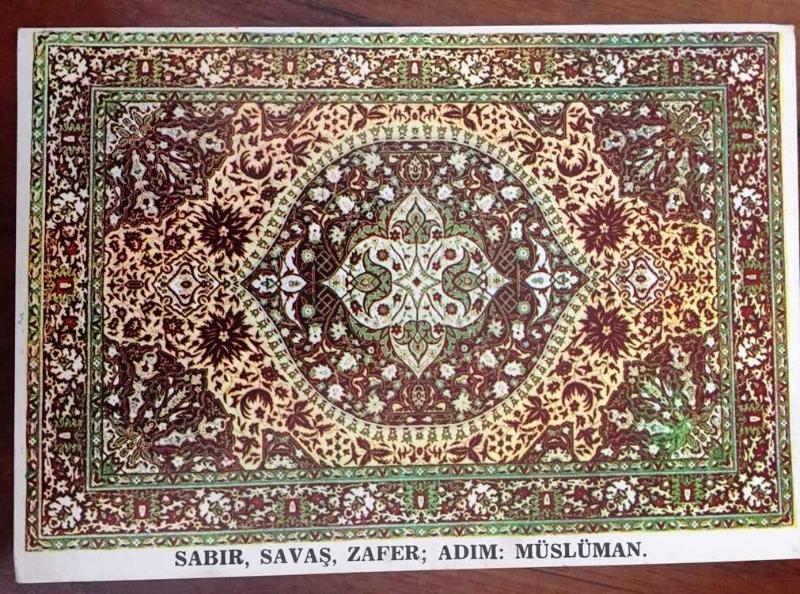 HEDİYE KARTPOSTALI, BİR BAŞKA ''SABIR, SAVAŞ, ZAFER; ADIM: MÜSLÜMAN'' YAZILI OSMANLI DÖNEMİ TÜRK HALI KİLİM DESENLERİ, ARKASI YAZILMAMIŞ, RENKLİ, 15 X 10 CM EBADINDA - 1940'LAR, 1950'LER, 1960'LAR, 1970'LER 1980'LER, en son 8 ay önce güncellenmiştir.