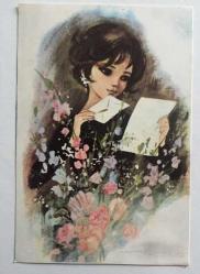 HEDİYE KARTPOSTALI, ÇİÇEKLERİN ÖNÜNDE MEKTUP OKUYAN GENÇ GÜZEL KIZ ÇİZİMİ, ARKASI YAZILMAMIŞ, RENKLİ, 11 X 15 CM EBADINDA - 1940'LAR, 1950'LER, 1960'LAR, 1970'LER 1980'LER, en son 8 ay önce güncellenmiştir.
