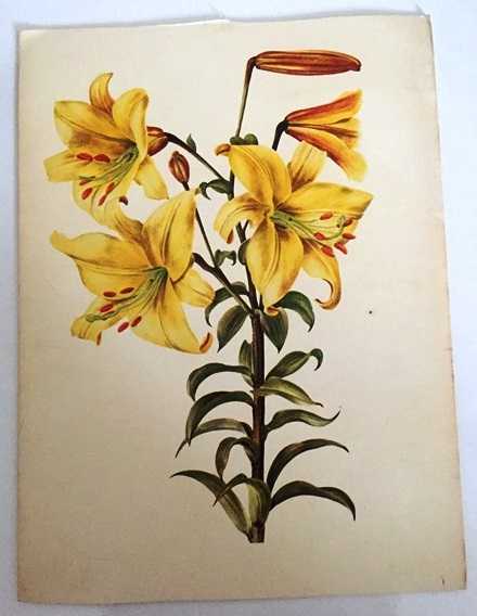 HEDİYE KARTPOSTALI, ÇİFT YAPRAK, BEYAZ FON ÜZERİNE SARI ZAMBAKLAR (ÇİZİM), İÇİ YAZILI, RENKLİ, 12 X 16 CM EBADINDA - 1940'LAR, 1950'LER, 1960'LAR, 1970'LER 1980'LER, en son 8 ay önce güncellenmiştir.