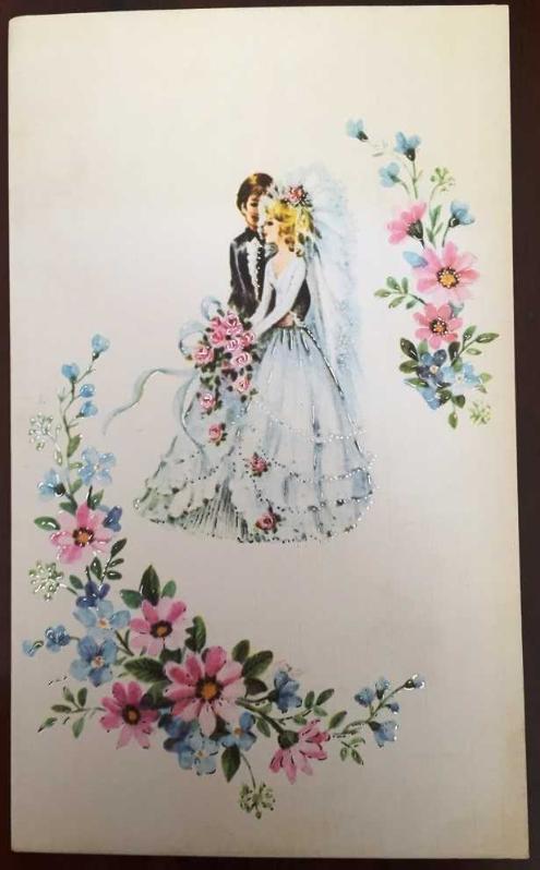 HEDİYE KARTPOSTALI, ÇİFT YAPRAK, ÇİÇEKLERİN ARASINA ÇİZİLMİŞ GELİN VE DAMAT RESMİ, ARKASI YAZILMAMIŞ, RENKLİ 16 X 9 CM EBADINDA - 1940'LAR, 1950'LER, 1960'LAR, 1970'LER 1980'LER, en son 7 ay önce güncellenmiştir.