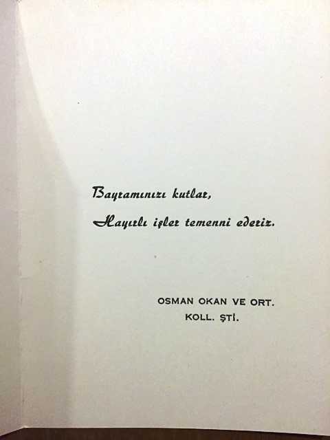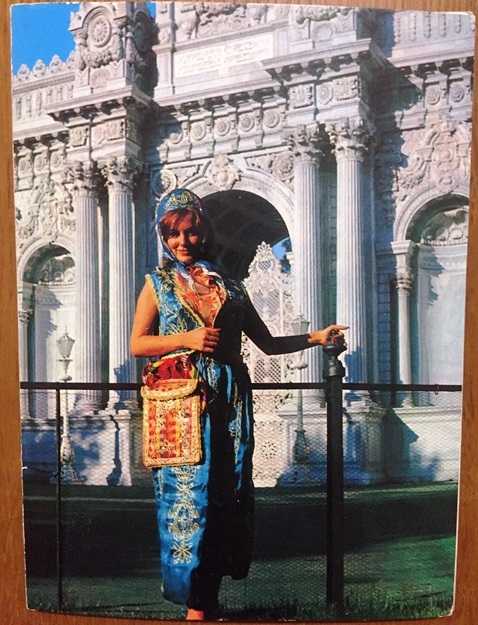 HEDİYE KARTPOSTALI, ÇİFT YAPRAK, DOLMABAHÇE SARAYI KAPISI ÖNÜNDE POZ VEREN OSMANLI KIYAFETİ GİYMİŞ GENÇ KIZ, İÇİ YAZILI (OSMAN OKAN VE ORTAKLARI, BAYRAM KUTLAMA MESAJI), RENKLİ, 11,5 X 16 CM EBADINDA - 1940'LAR, 1950'LER, 1960'LAR, 1970'LER 1980'LER, en son 8 ay önce güncellenmiştir.