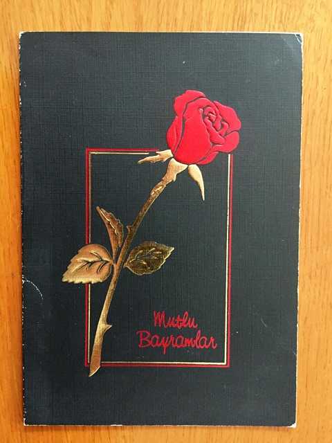 HEDİYE KARTPOSTALI, ÇİFT YAPRAK, ''MUTLU BAYRAMLAR'' YAZILI SİYAH FON ÜZERİNE ALTIN SARISI DAL VE YAPRAĞA SAHİP KIRMIZI GÜL, İÇİ YAZILI, RENKLİ, 12 X 16 CM EBADINDA - 1940'LAR, 1950'LER, 1960'LAR, 1970'LER 1980'LER, en son 8 ay önce güncellenmiştir.