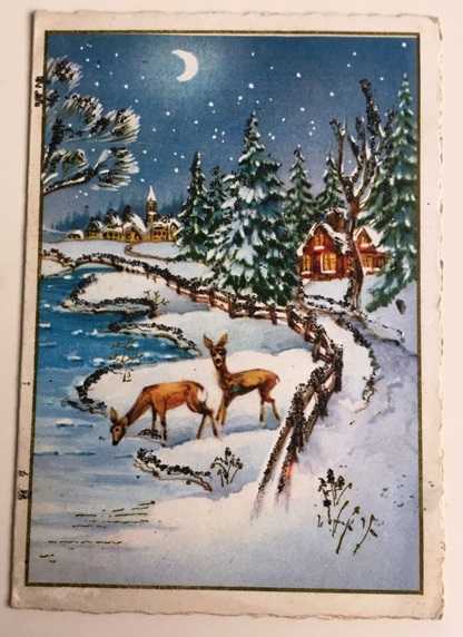 HEDİYE KARTPOSTALI, ÇİFT YAPRAK, NEHİR KENARINDA SU İÇEN GEYİKLER, ÇAM AĞAÇLARI, GÖKYÜZÜNDE AY VE AHŞAP KÖY EVİ, ÇOK GÜZEL BİR KAR VE KIŞ MANZARASI, SİMLİ, ARKASI YAZILI, RENKLİ, 8,5 X 12 CM EBADINDA - 1940'LAR, 1950'LER, 1960'LAR, 1970'LER 1980'LER, en son 8 ay önce güncellenmiştir.