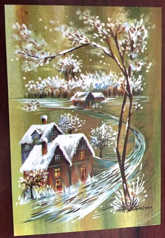 HEDİYE KARTPOSTALI, FISTIK YEŞİLİ FON ÜZERİNE KARLA KAPLI AĞAÇLARIN VE EVLERİN OLDUĞU GÜZEL BİR KIŞ RESMİ ÇİZİMİ, ARKASI YAZILI, RENKLİ, 15 X 10 CM EBADINDA - 1940'LAR, 1950'LER, 1960'LAR, 1970'LER 1980'LER, en son 8 ay önce güncellenmiştir.