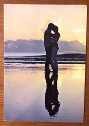 HEDİYE KARTPOSTALI, GÜNBATIMINDA KUMSALDA BİRBİRİNE SARILMIŞ ÖPÜŞEN BİR ÇİFT, ROMANTİK BİR KARE, ARKASI YAZILMAMIŞ, RENKLİ, 10 X 15 CM EBADINDA - 1940'LAR, 1950'LER, 1960'LAR, 1970'LER 1980'LER, en son 8 ay önce güncellenmiştir.