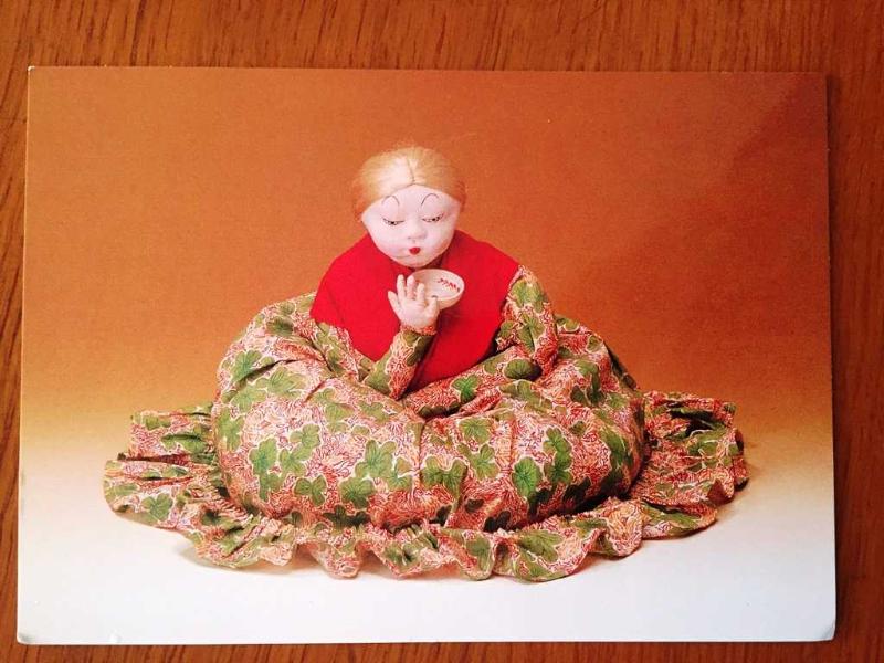 HEDİYE KARTPOSTALI, JAPON KÜLTÜRÜ, YERDE OTURUP ÇAY İÇEN YAŞLI KADIN OYUNCAĞI, ARKASI YAZILMAMIŞ, RENKLİ, 11 X 15 CM EBADINDA - 1940'LAR, 1950'LER, 1960'LAR, 1970'LER 1980'LER, en son 8 ay önce güncellenmiştir.