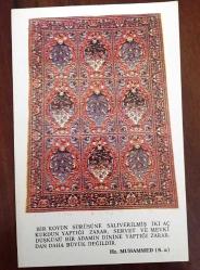 HEDİYE KARTPOSTALI, KIRMIZI TONLARINDA TONLARONDA OSMANLI DÖNEMİ TÜRK HALI KİLİM DESENLERİ MOTİFİ, HZ. MUHAMMED'İN SÖZÜNÜN YAZILI OLDUĞU BİR NOT İLE, ARKASI YAZILMAMIŞ, RENKLİ, 10 X 14 CM EBADINDA, en son 1 yıl önce güncellenmiştir.
