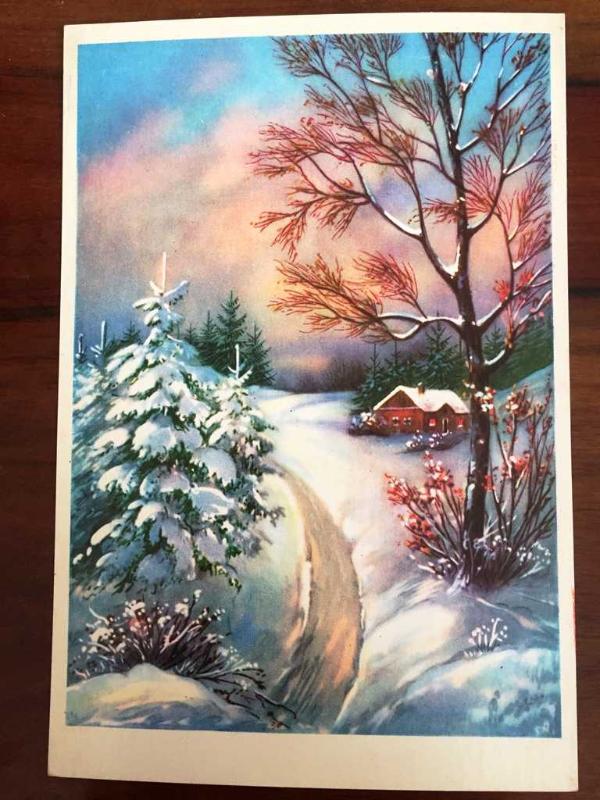 HEDİYE KARTPOSTALI, KIŞ MANZARASI ÇİZİMİ, UZAKLARDAKİ AHŞAP BİR KÖY EVİ, KARLA ÖRTÜLÜ ÇAM AĞAÇLARI VE EN GÜZEL RENKLERE BÜRÜNMÜŞ GÖKYÜZÜ, ARKASI YAZILI, RENKLİ, 10 X 15 CM EBADINDA - 1940'LAR, 1950'LER, 1960'LAR, 1970'LER 1980'LER, en son 8 ay önce güncellenmiştir.