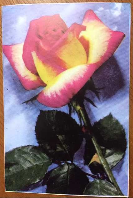 HEDİYE KARTPOSTALI, MAVİ FON ÜZERİNE İÇİ SARI DESENLİ PEMBE GÜL VE YEŞİL YAPRAKLARI, ARKASI YAZILMAMIŞ, RENKLİ, 15 X 10 CM EBADINDA - 1940'LAR, 1950'LER, 1960'LAR, 1970'LER 1980'LER, en son 8 ay önce güncellenmiştir.