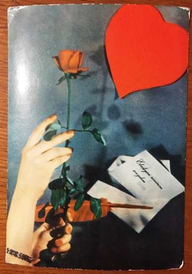 HEDİYE KARTPOSTALI, NARİN ELLERLE TUTULMUŞ KIRMIZI GÜL DALI VE KIRMIZI KALP, ARKASI YAZILI, RENKLİ, 10 X 15 CM EBADINDA - 1940'LAR, 1950'LER, 1960'LAR, 1970'LER 1980'LER, 1 yıl önce satışa sunulmuştur.