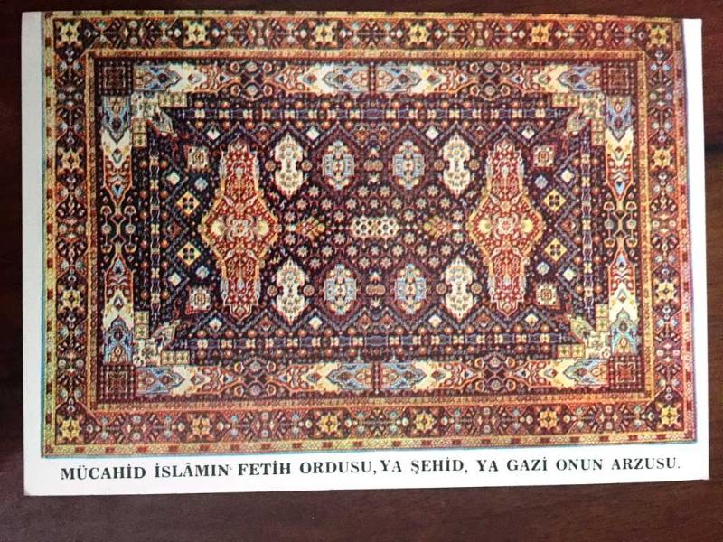 HEDİYE KARTPOSTALI, OSMANLI DÖNEMİ TÜRK HALI KİLİM DESENLERİ MOTİFİ ''MÜCAHİD İSLAMIN FETİH ORDUSU YA ŞEHİD YA DA GAZİ ONUN ARZUSU'' NOTLU , ARKASI YAZILMAMIŞ, RENKLİ, 10 X 14 CM EBADINDA, en son 1 yıl önce güncellenmiştir.