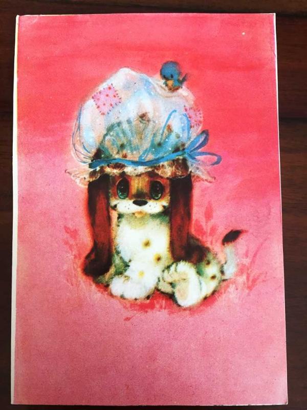 HEDİYE KARTPOSTALI, PEMBE FON ÜZERİNE BAŞINDA KUŞ OLAN KÜÇÜK YAVRU KÖPEK ÇİZİMİ, ARKASI YAZILMAMIŞ, RENKLİ, 11 X 15 CM EBADINDA - 1940'LAR, 1950'LER, 1960'LAR, 1970'LER 1980'LER, en son 7 ay önce güncellenmiştir.