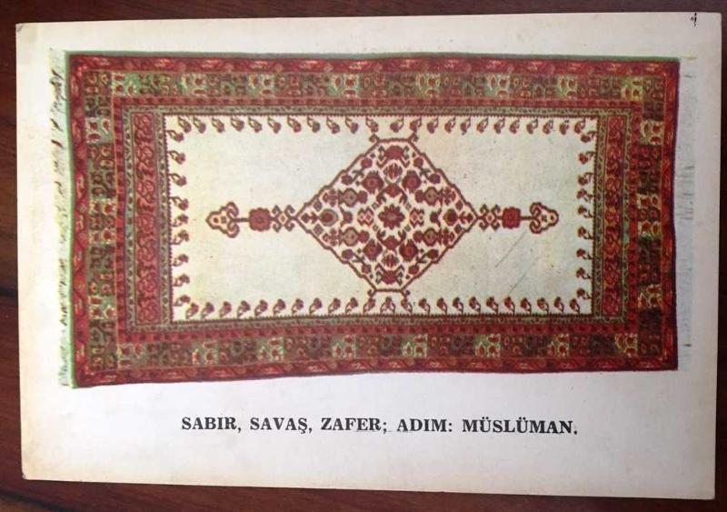 HEDİYE KARTPOSTALI, ''SABIR, SAVAŞ, ZAFER; ADIM: MÜSLÜMAN'' YAZILI OSMANLI DÖNEMİ TÜRK HALI KİLİM DESENLERİ, ARKASI YAZILMAMIŞ, RENKLİ, 15 X 10 CM EBADINDA - 1940'LAR, 1950'LER, 1960'LAR, 1970'LER 1980'LER, en son 8 ay önce güncellenmiştir.